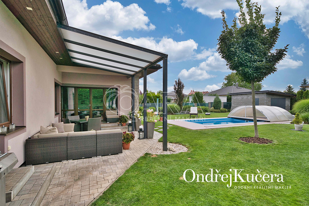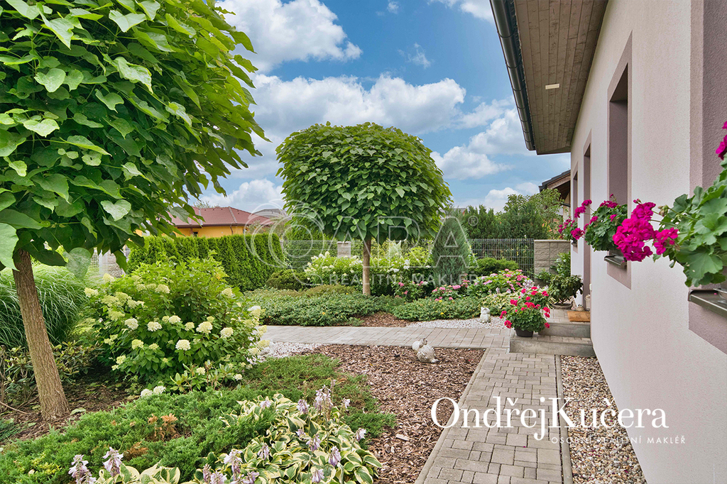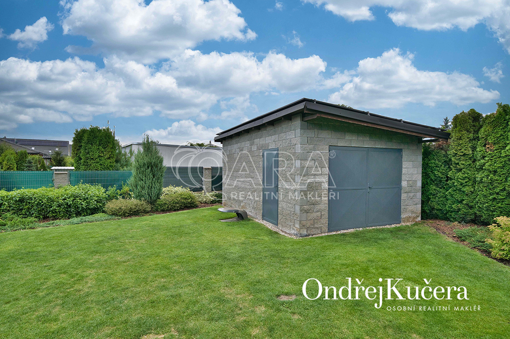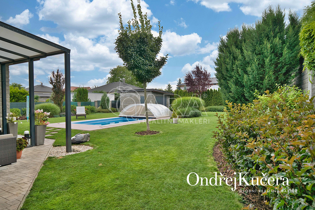 Zahrada kolem domu byla promyšleně navržena a realizována zahradním architektem, aby se během roku měnila v pestrou podívanou. Automatický zavlažovací systém napojený na vlastní vrt a retenční nádrž zajišťuje její nenáročnou údržbu. Je zde také zapuštěný keramický bazén a samostatný zděný zahradní domek s dílnou. Součástí prodeje je i automatická sekačka Husqvarna, Thermomix TM6, iRobot Roomba na vysávání, iRobot na vytírání a robot na čištění bazénu.
