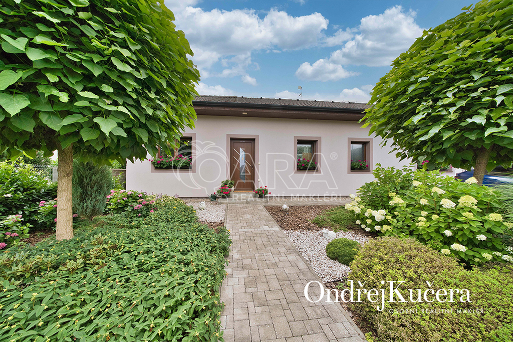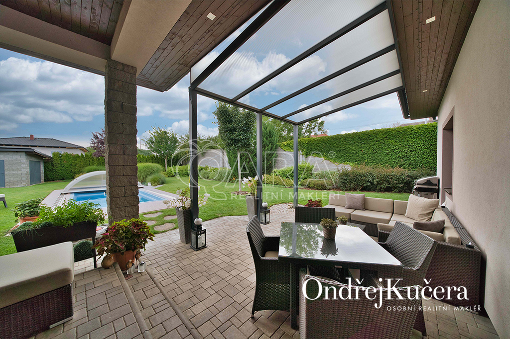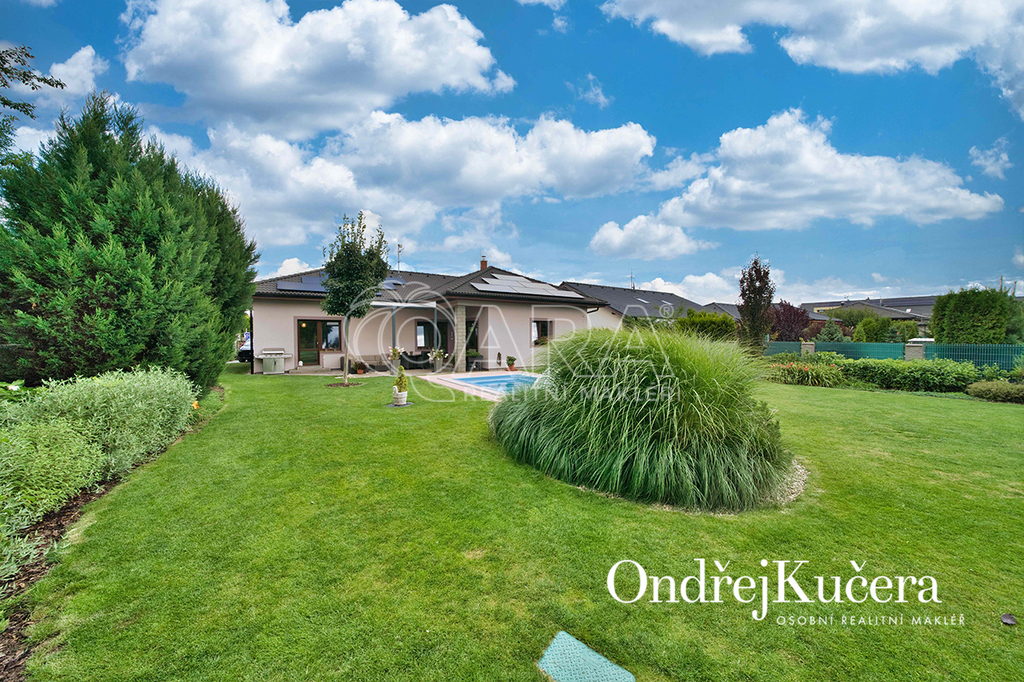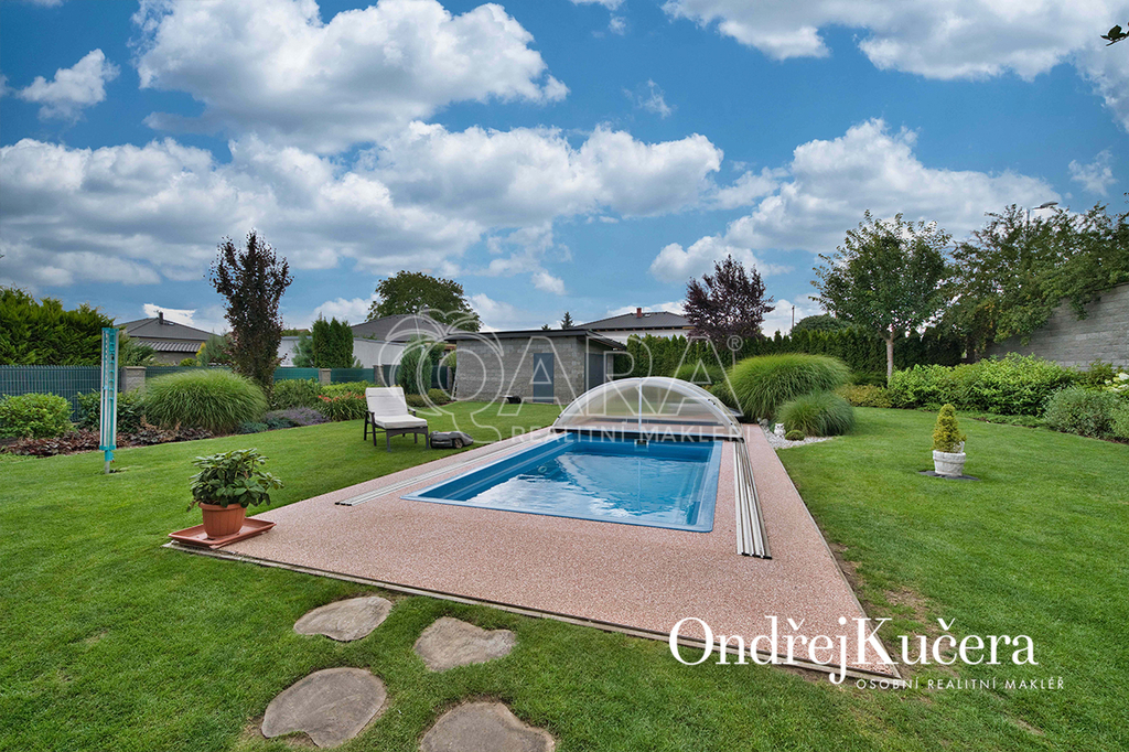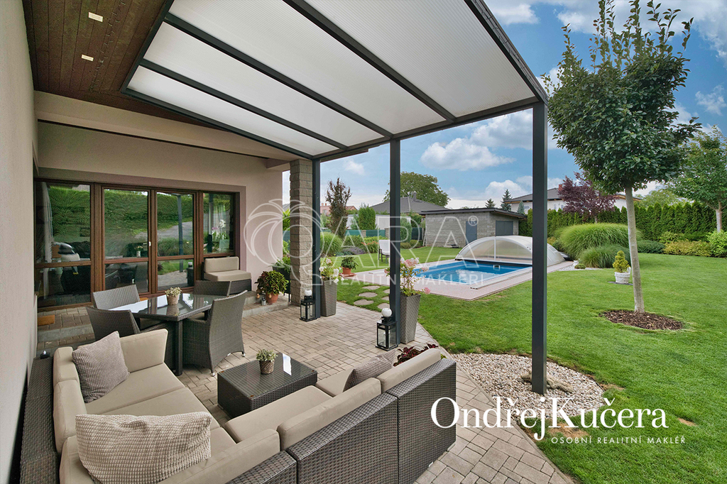 Zahrada kolem domu byla promyšleně navržena a realizována zahradním architektem, aby se během roku měnila v pestrou podívanou. Automatický zavlažovací systém napojený na vlastní vrt a retenční nádrž zajišťuje její nenáročnou údržbu. Je zde také zapuštěný keramický bazén a samostatný zděný zahradní domek s dílnou. Součástí prodeje je i automatická sekačka Husqvarna, Thermomix TM6, iRobot Roomba na vysávání, iRobot na vytírání a robot na čištění bazénu.