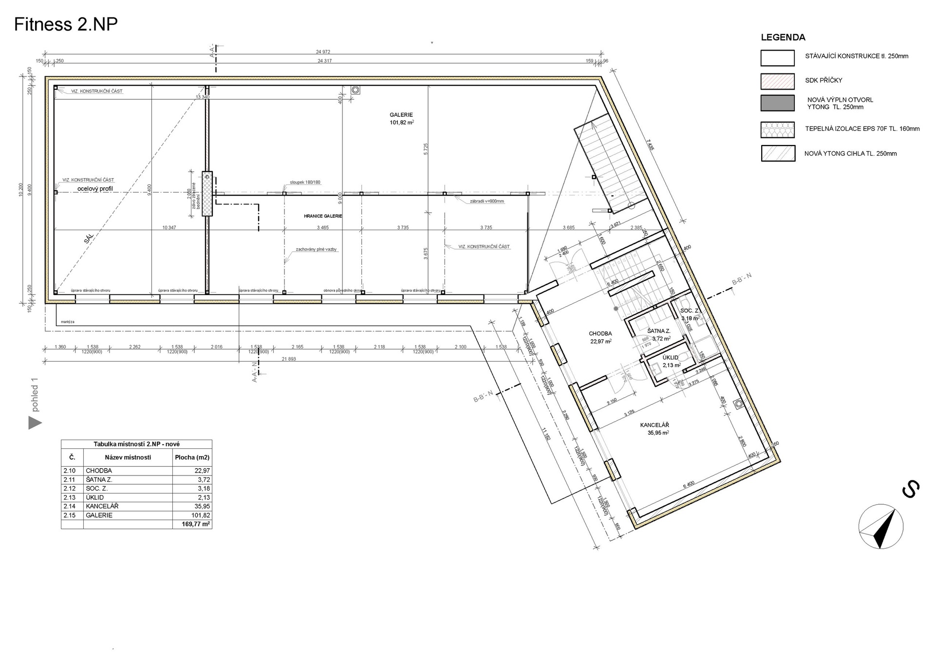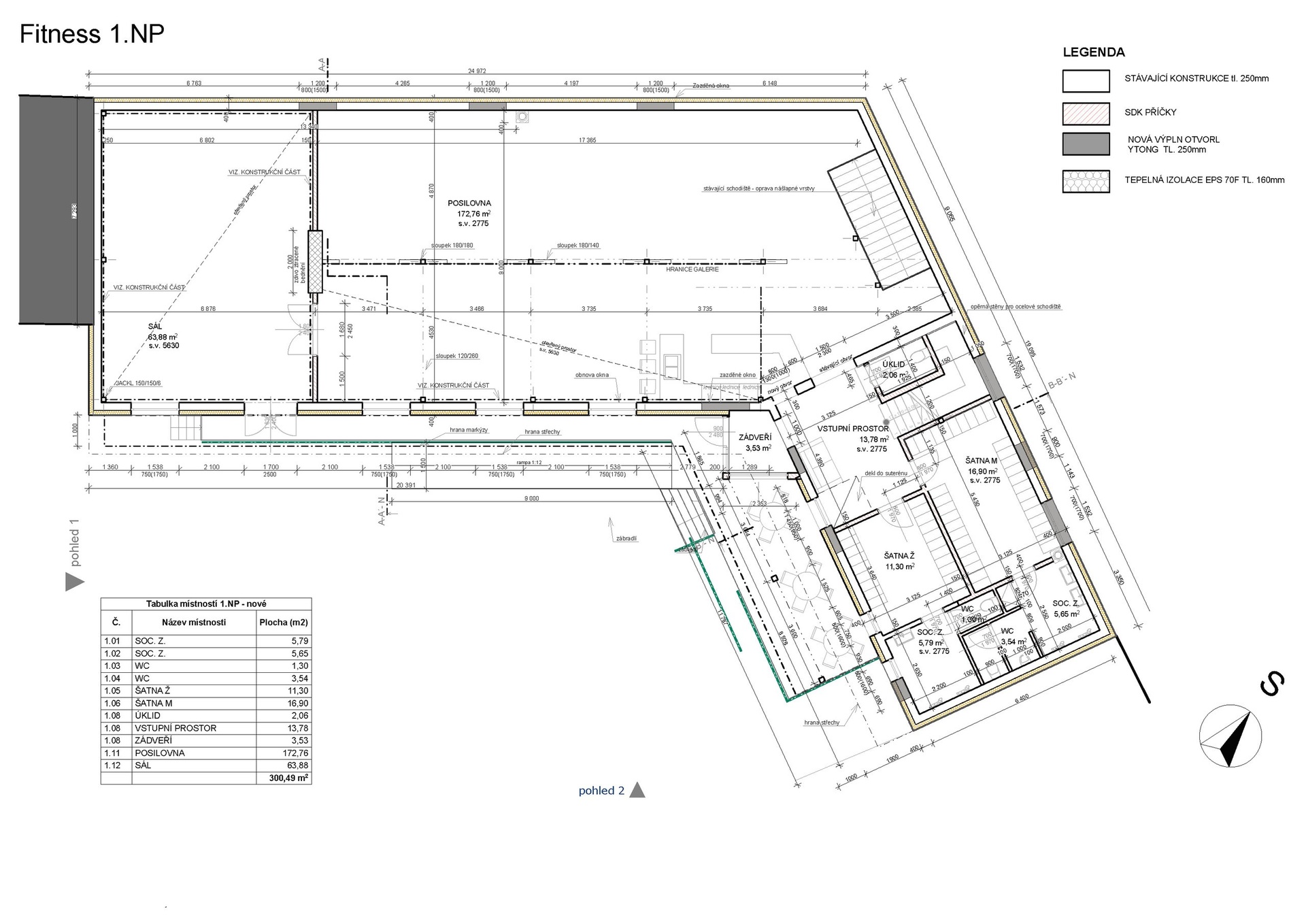 Nabízený sklad je ve stavu k rekonstrukci a projekt počítá s celkem 470 m2 užitné plochy ve dvou podlažích. Z toho je v plánu cca 273 m2 plochy k cvičení, zbytek tvoří zázemí.