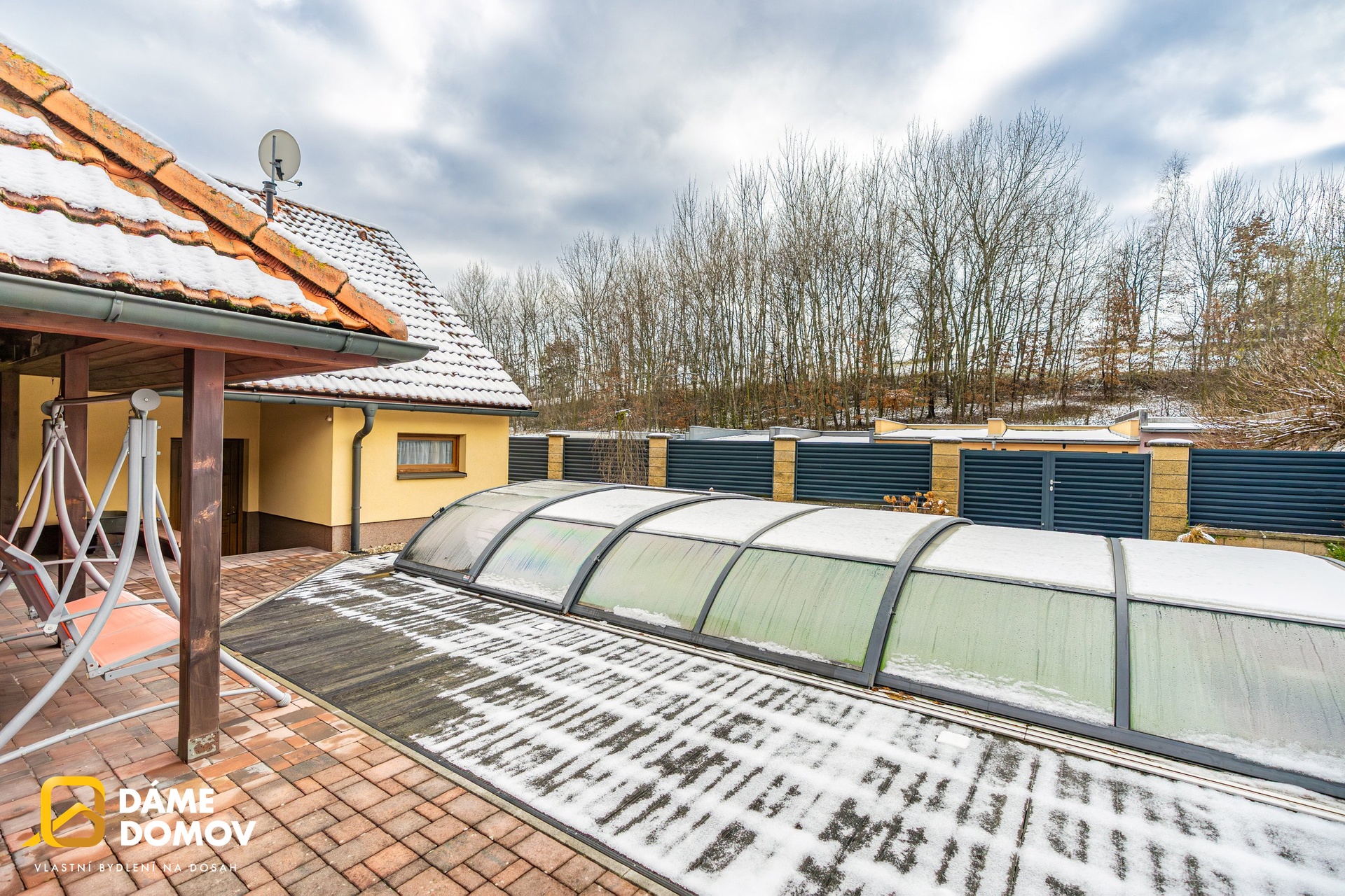Velkým benefitem jsou také solární panely, které neslouží jen k vyhřátí bazénu, ale v letních měsících pomáhají i s ohřevem vody pro domácnost – úsporné řešení a vyšší komfort bydlení.