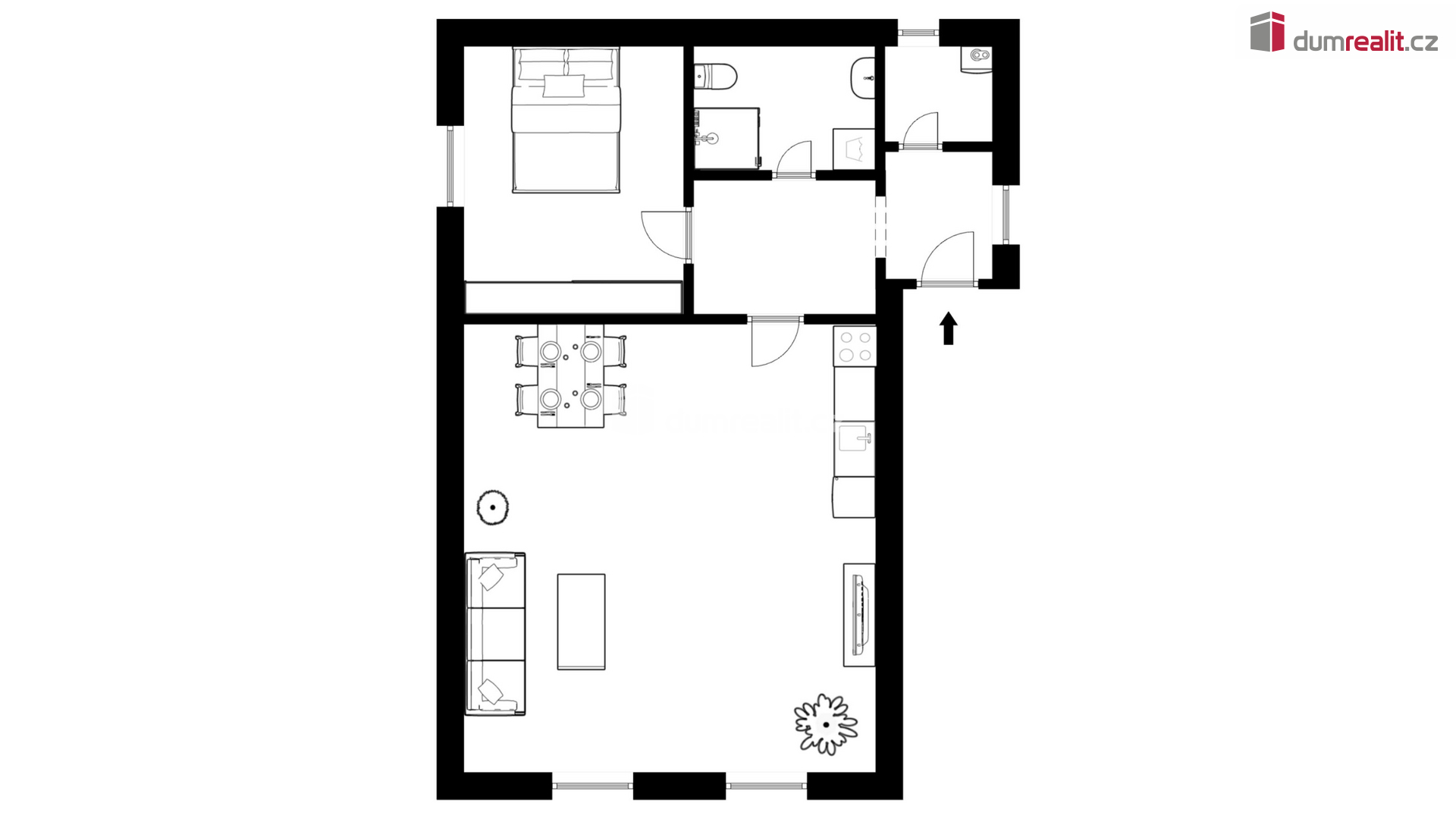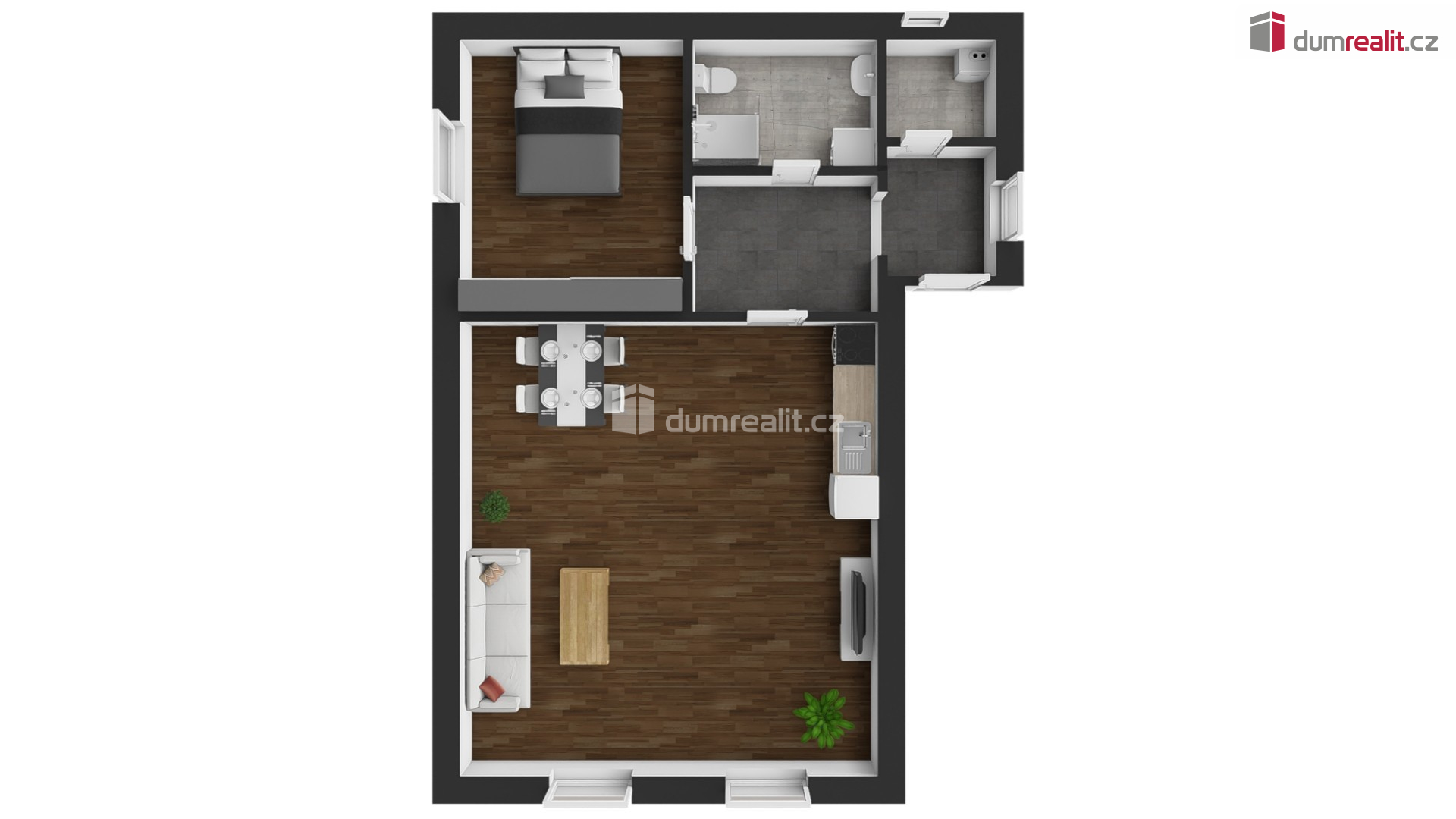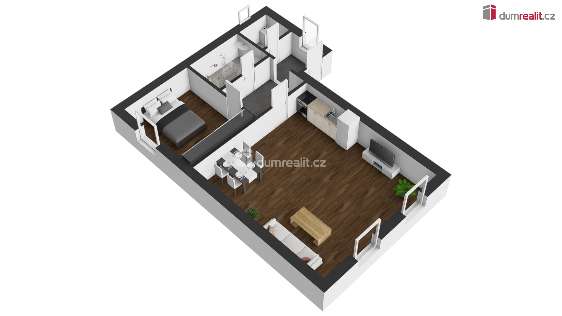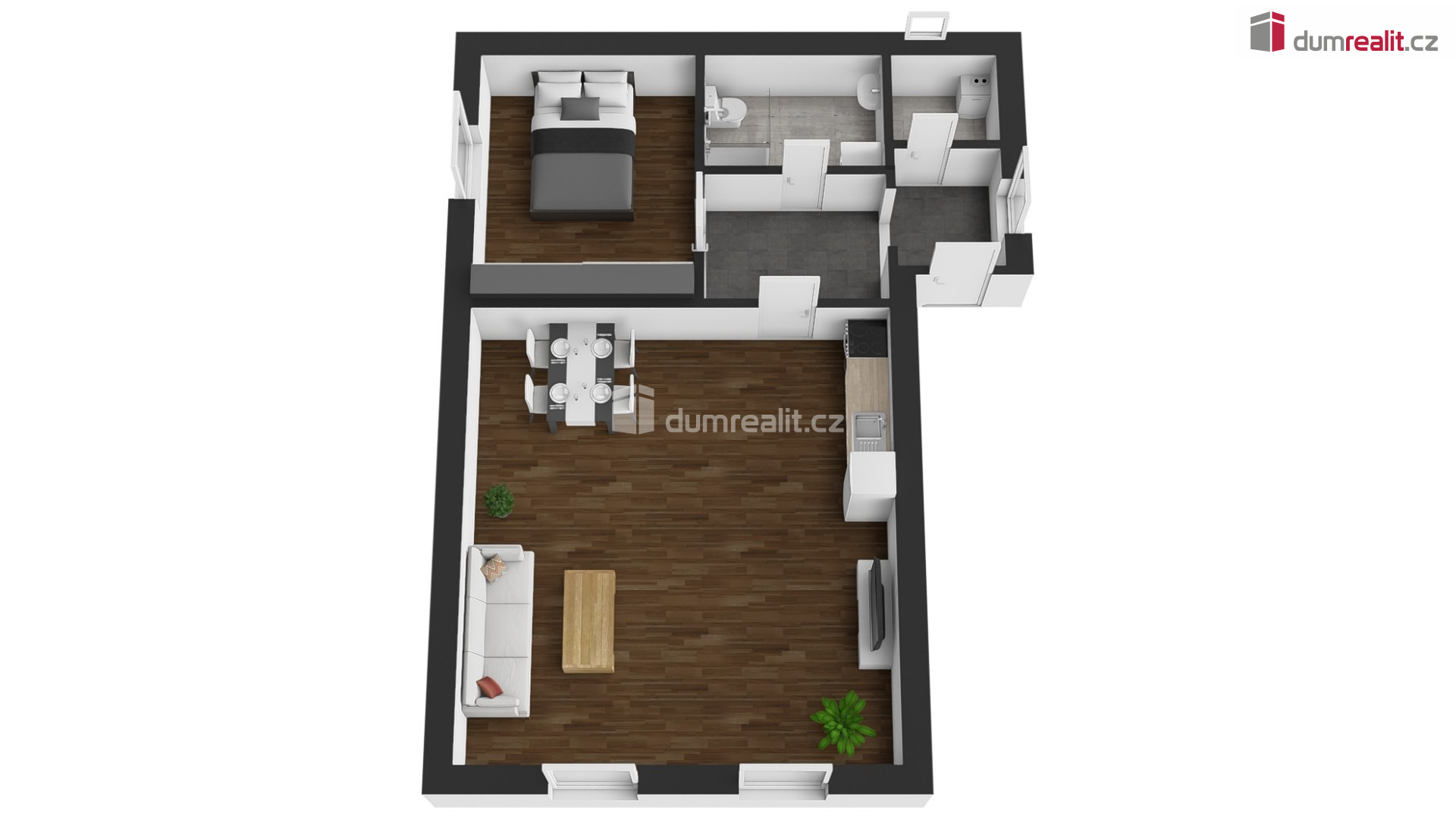 Dispozice 2+1 na zastavěné ploše 80 m² s pozemkem 515 m² je navržena tak, aby fungovala pro dva. Obývací pokoj s kuchyňským koutem, ložnice, koupelna s WC, technická místnost.
