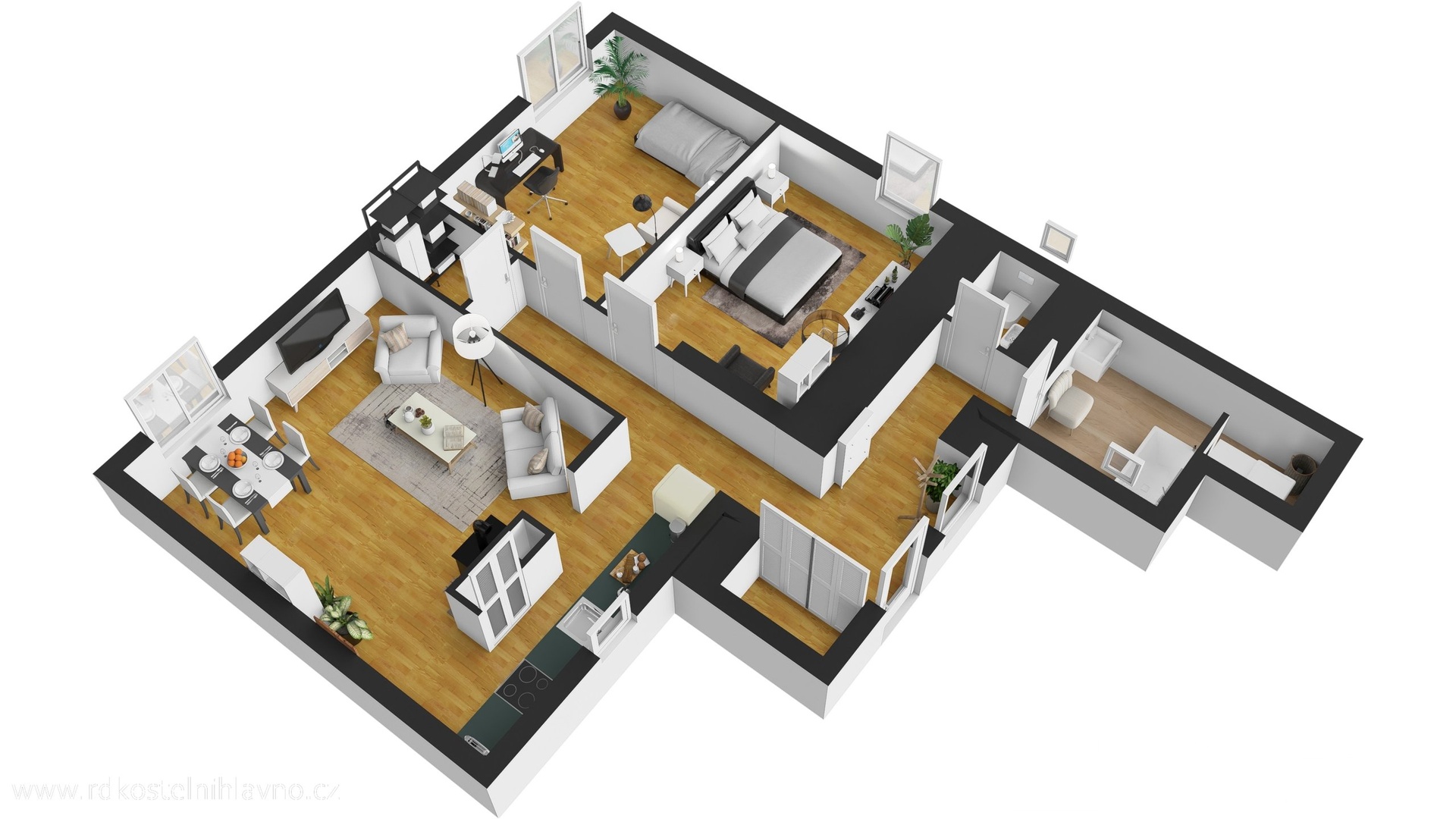 V přízemí vás přivítá světlá a prostorná vstupní chodba se skrytou šatnou, která nabízí dostatek úložného prostoru. Z chodby se dostanete do hlavní obytné části – kuchyně, která je vybavena vestavěnými spotřebiči a prakticky oddělena od obývacího pokoje komínem s krbem. Dále je zde ložnice a další pokoj, který lze využít například jako dětský nebo pracovní. Koupelna je laděná do moderního stylu, s designovou betonovou stěrkou, která je téměř bezúdržbová, a vedle ní se nachází samostatná toaleta.