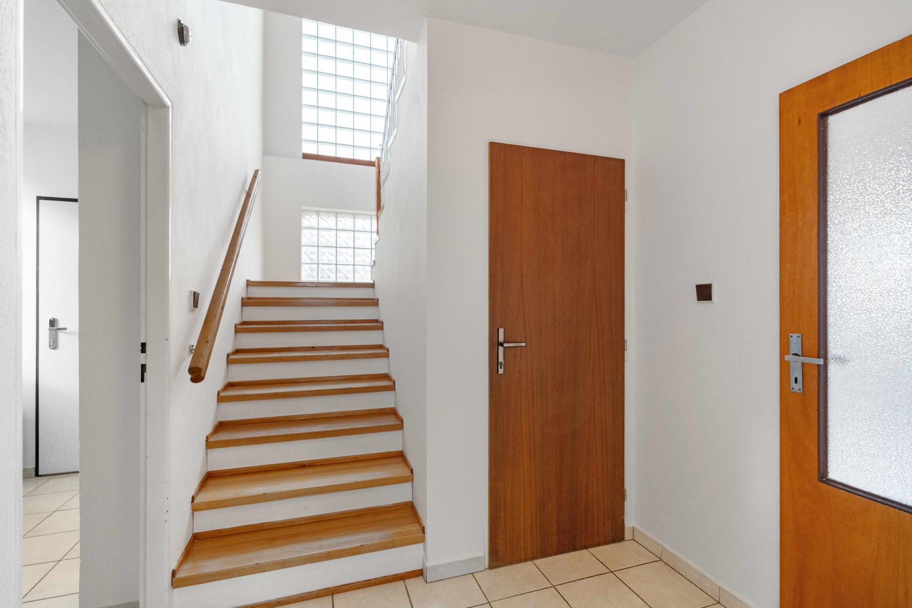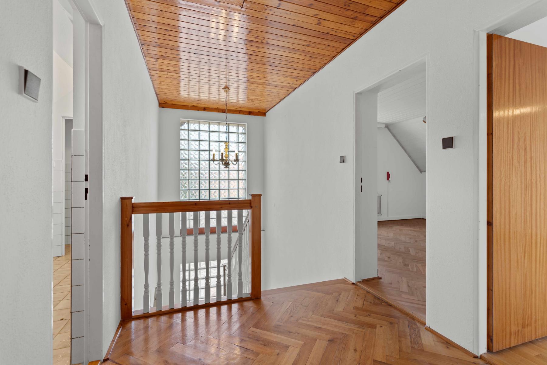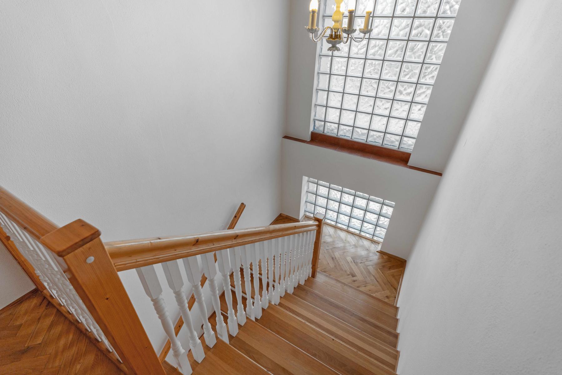 V patře jsou k dispozici tři samostatné pokoje koupelna s komorou a toaleta. Interiér působí velmi udržovaně, s dřevěnými prvky a parketovými podlahami, které dodávají domu příjemnou atmosféru.