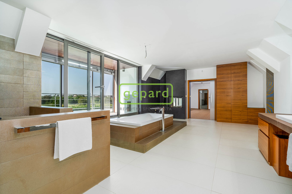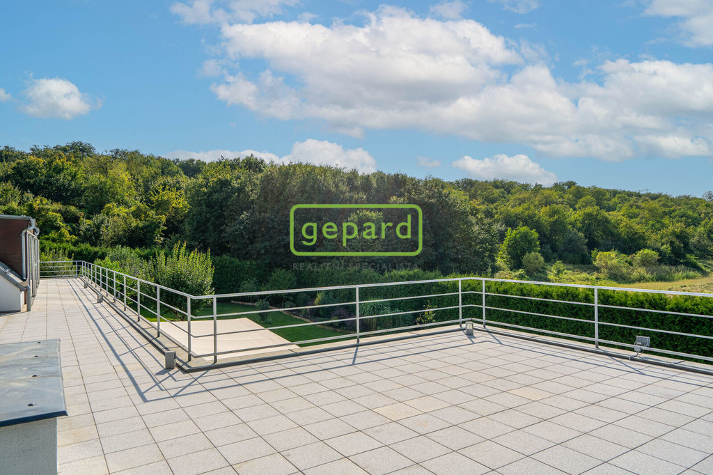 Z horních místností, včetně velké koupelny jsou vstupy na západně orientovanou terasu s otevřeným výhledem do okolní krajiny.