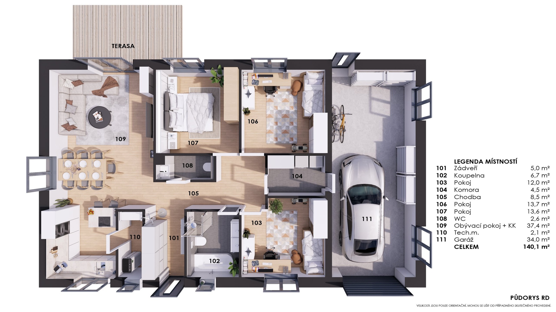 Dům disponuje třemi prostornými ložnicemi, které poskytují dostatek soukromí pro všechny členy rodiny. Koupelna je vybavena moderními sanitárními prvky včetně sprchového koutu a vany a nabízí komfortní zázemí. Obývací pokoj je propojen s kuchyňským koutem a vstupem na terasu s pergolou. Součástí nemovitosti je také garáž, která poskytuje bezpečné parkování a úložný prostor pro další vybavení. V současné chvíli je ještě možné zasáhnout do výběru sanity nebo podlahových krytin. Podlahové vytápění v domě je zajištěno tepelným čerpadlem, stejně tak i ohřev teplé vody, což zaručuje nízké provozní náklady. Obývací pokoj a chodba mezi pokoji jsou osazeny klimatizací. Jedná se o zděnou stavbu se zateplením, PENB B, kolaudace je naplánována na 01/2026. Součástí kupní ceny je oplocení pozemku, zpevněné stání před garáží pro další automobil, automatická elektrická brána, chodníček atd. Kuchyňská linka není součástí kupní ceny.