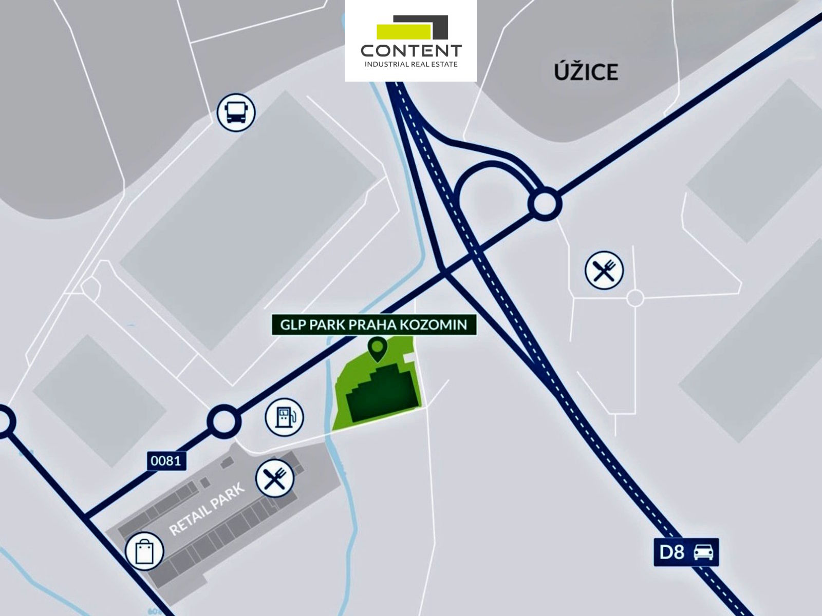V zastoupení majitele a bez provize nabízíme prostory vhodné pro sklad, velkoobchod nebo výrobu, umístěné přímo u sjezdu z dálnice D8, EXIT 9 Úžice. Novostavba samostatné industriální budovy s celkovou výměrou 7600 m²: