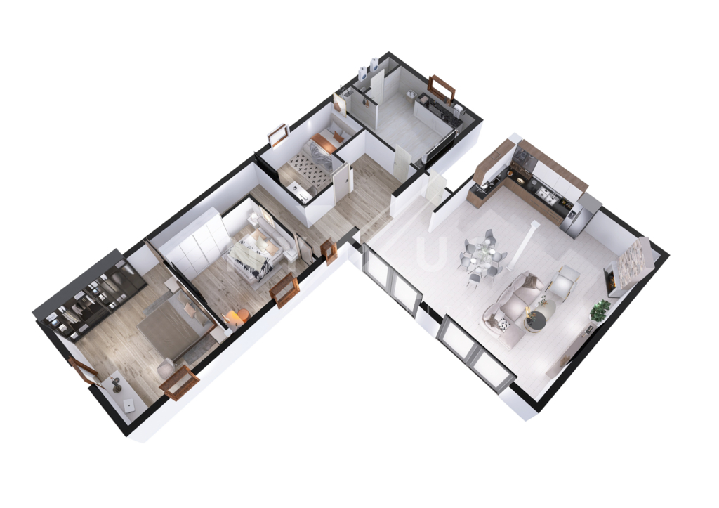 Už při vstupu zaujme velký a světlý obývací pokoj, který přirozeně navazuje na terasu a zahradu. Je to místo, kde se budete rádi scházet s rodinou i přáteli, ať už v zimě u krbu, nebo v létě s otevřenými dveřmi na terasu. Kuchyň s jídelní částí tvoří přirozené centrum celého domu a poskytuje dostatek prostoru pro každodenní vaření i společné večeře.