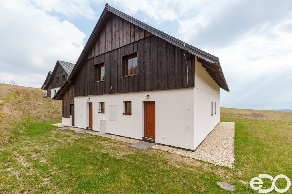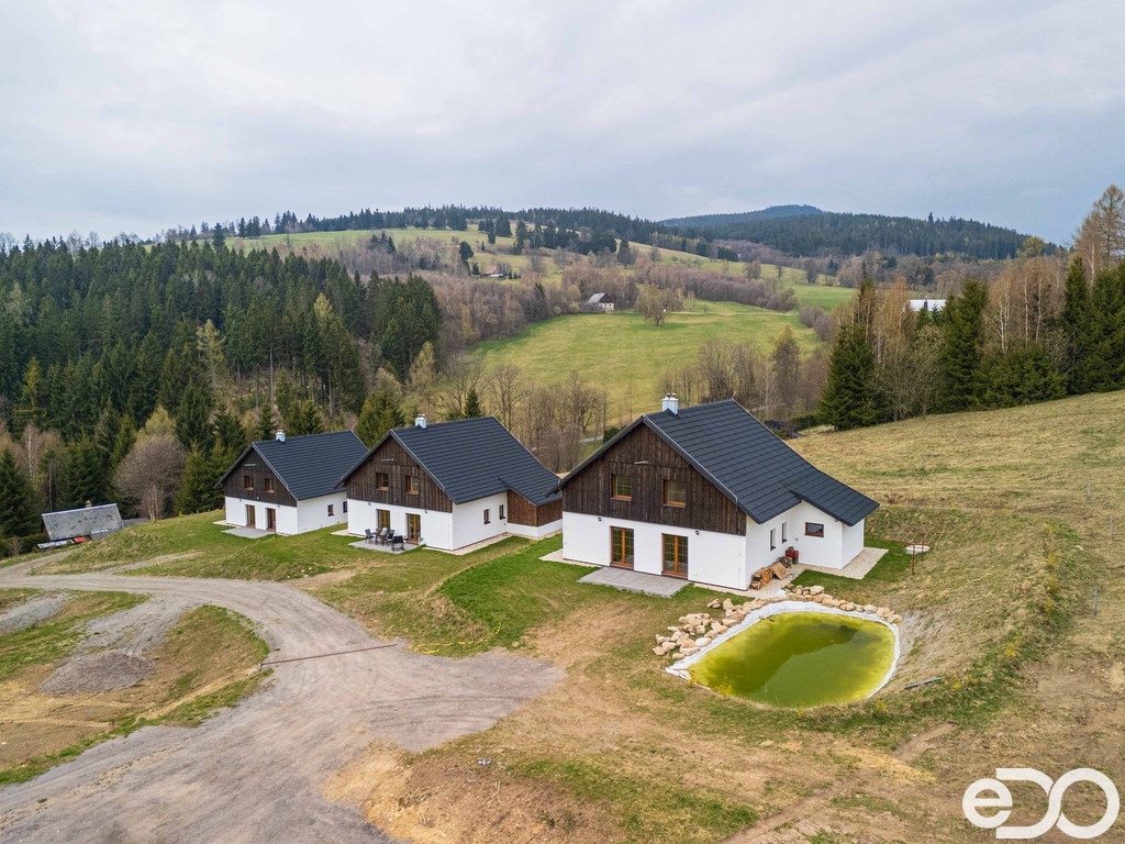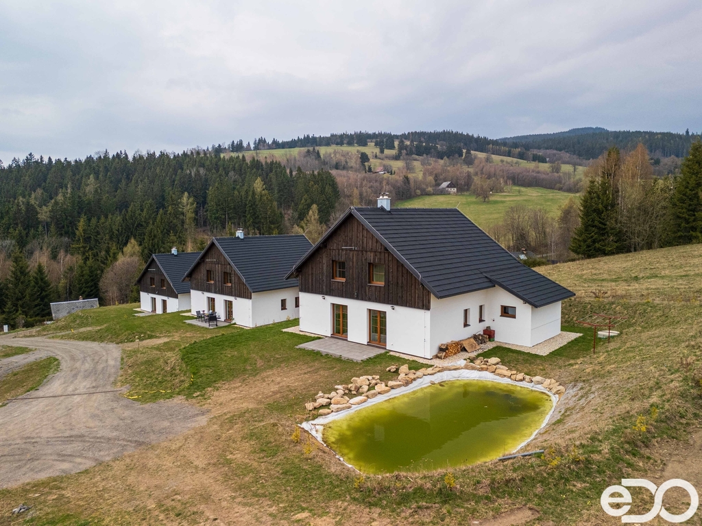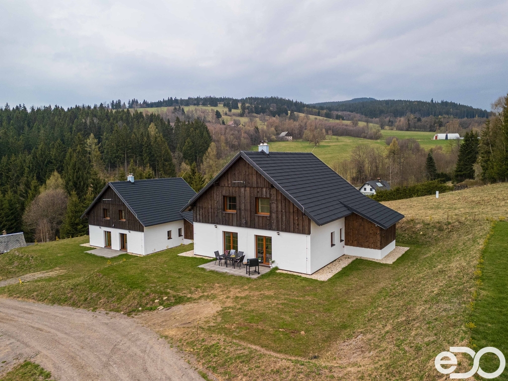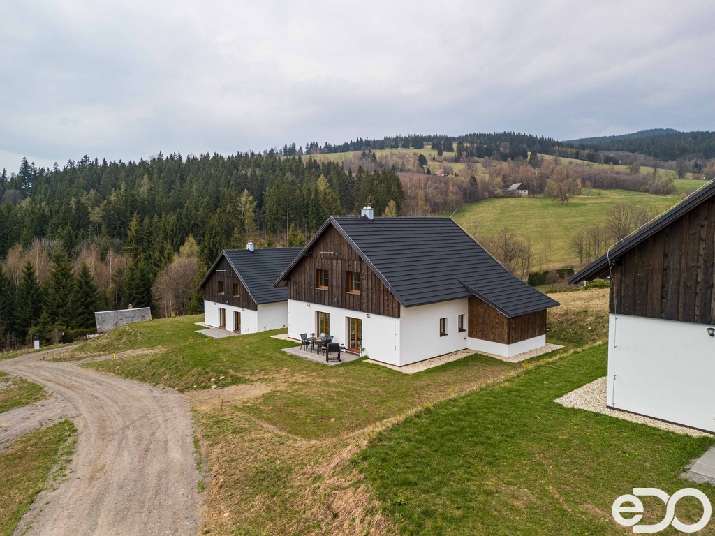 Ve výhradním zastoupení majitele nabízím k prodeji dům se dvěma apartmány o dispozici 3+kk, situovaný na krásném místě s výhledem do okolních hor. Apartmán o celkové ploše cca 100 m², představuje ideální místo pro odpočinek v srdci přírody, pouhé 2 km od oblíbeného horského střediska Dolní Morava. Apartmány zaujmou svou útulnou atmosférou, která spojuje moderní prvky s přírodními materiály. V interiéru najdete dřevěné schody, pokoje obložené dřevem a v přízemí krbová kamna, která dotvářejí příjemný horský charakter nemovitosti. Vytápění je doplněno elektrickými přímotopy. Součástí každého apartmánu je moderní sprchovým kout společně s toaletou v dekoru imitace dřeva, stylově doplněný černými prvky. Každý dům má vlastní dřevěnou kůlnu na nářadí. Pro všechny objekty je zajištěna společná voda a ČOV.