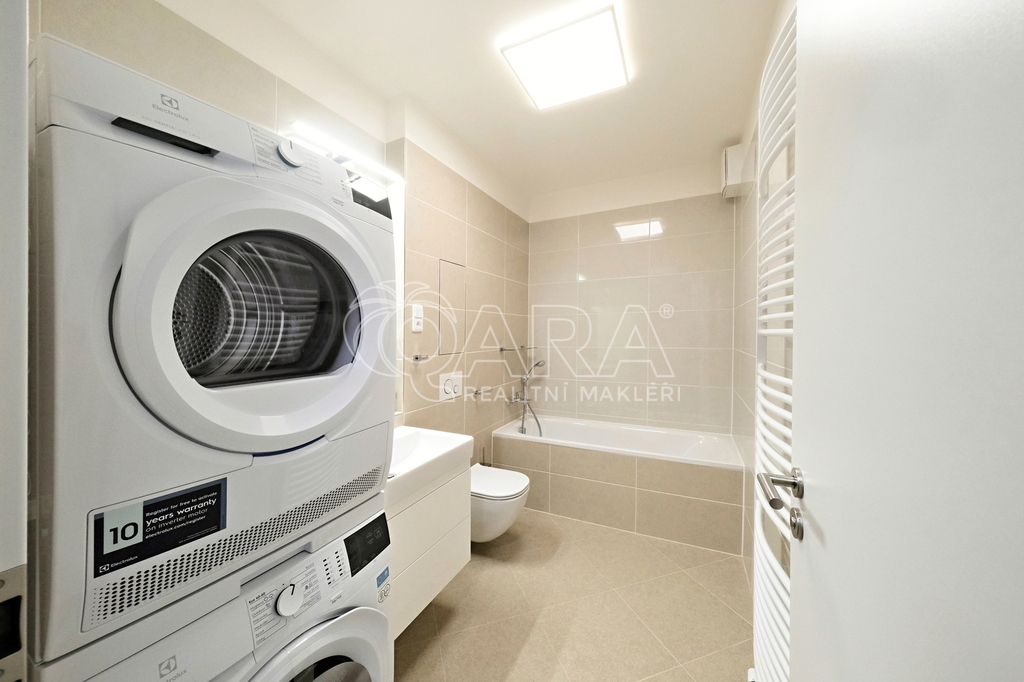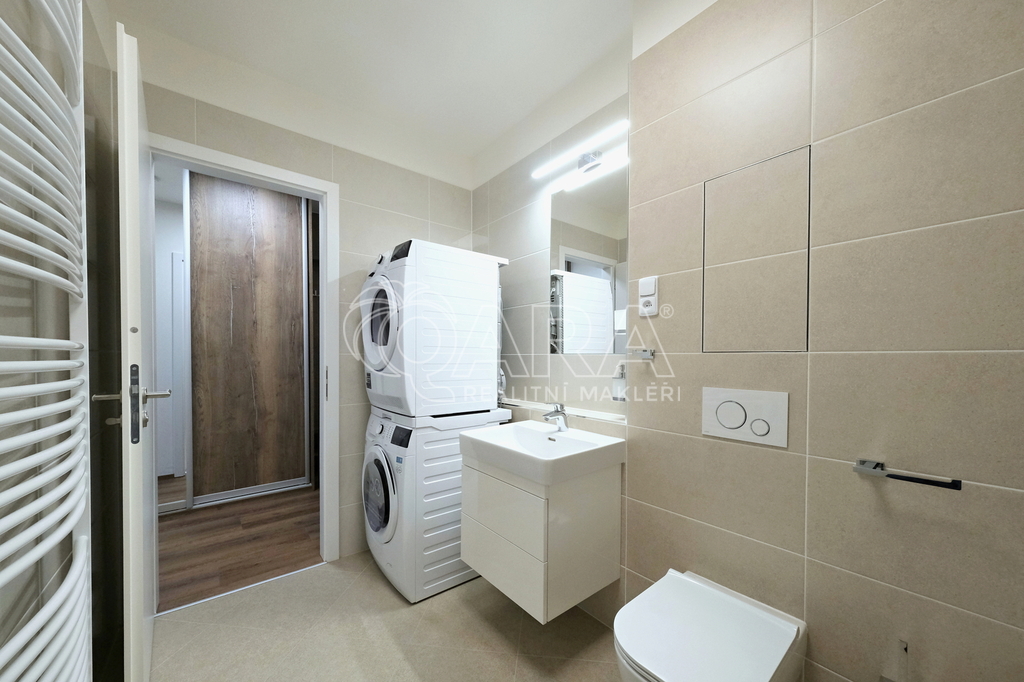 Zatím nikým neobývaný prostor je velmi vkusně a prakticky vybaven. Neutrální tóny umožňují kombinaci s barvami dle vlastního vkusu, kvalitní použité materiály a moderní tvary pak vyvolávají pocit příjemného nadstandardu.