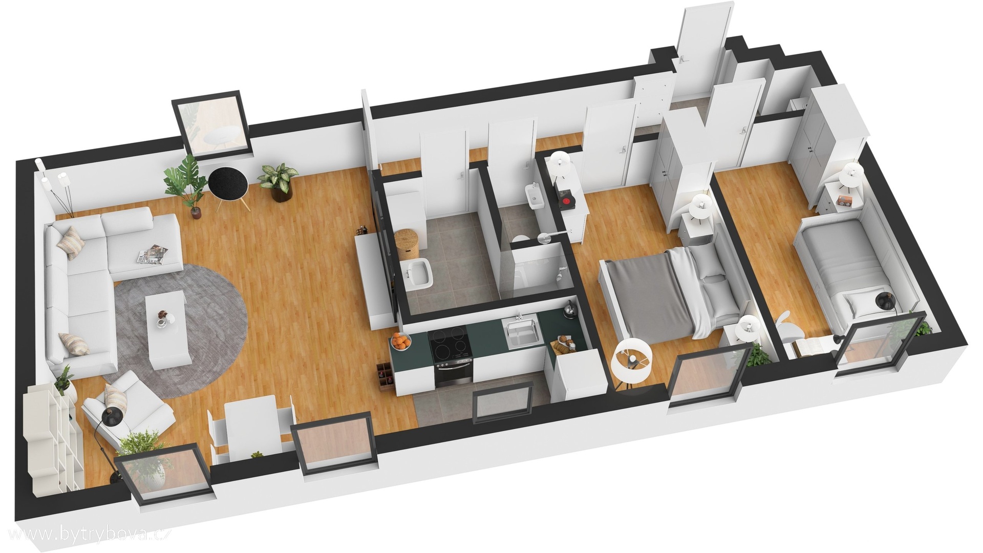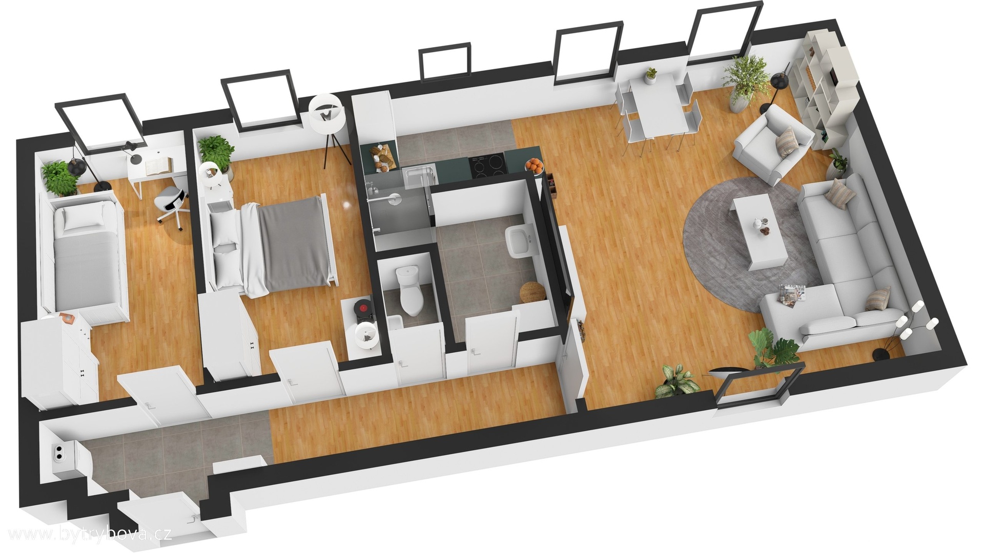 - Obývací pokoj s kuchyňským koutem – prostorný, světlý, ideální pro rodinu