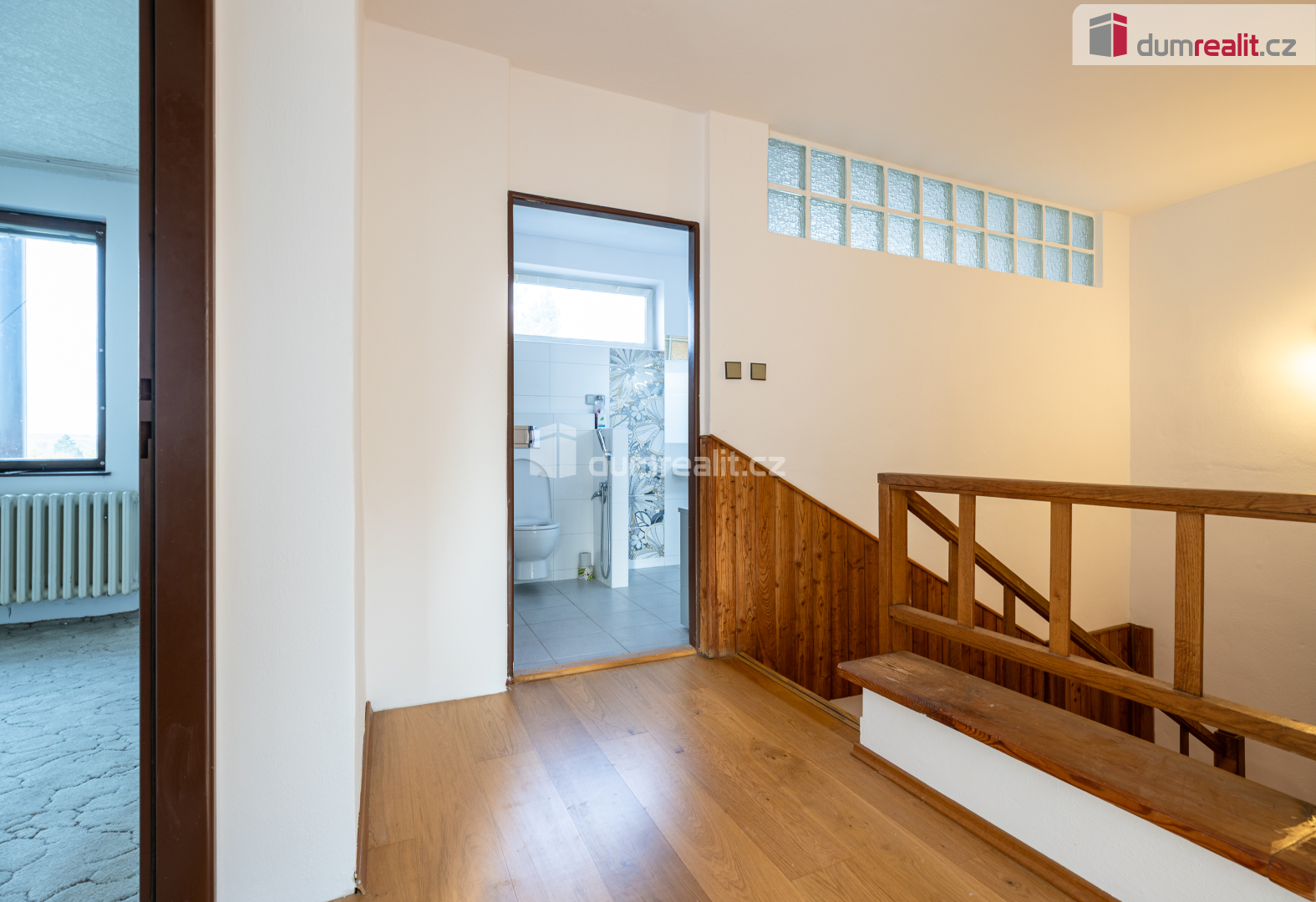 Dominantou chodby je dřevěné schodiště a obložení stěn.