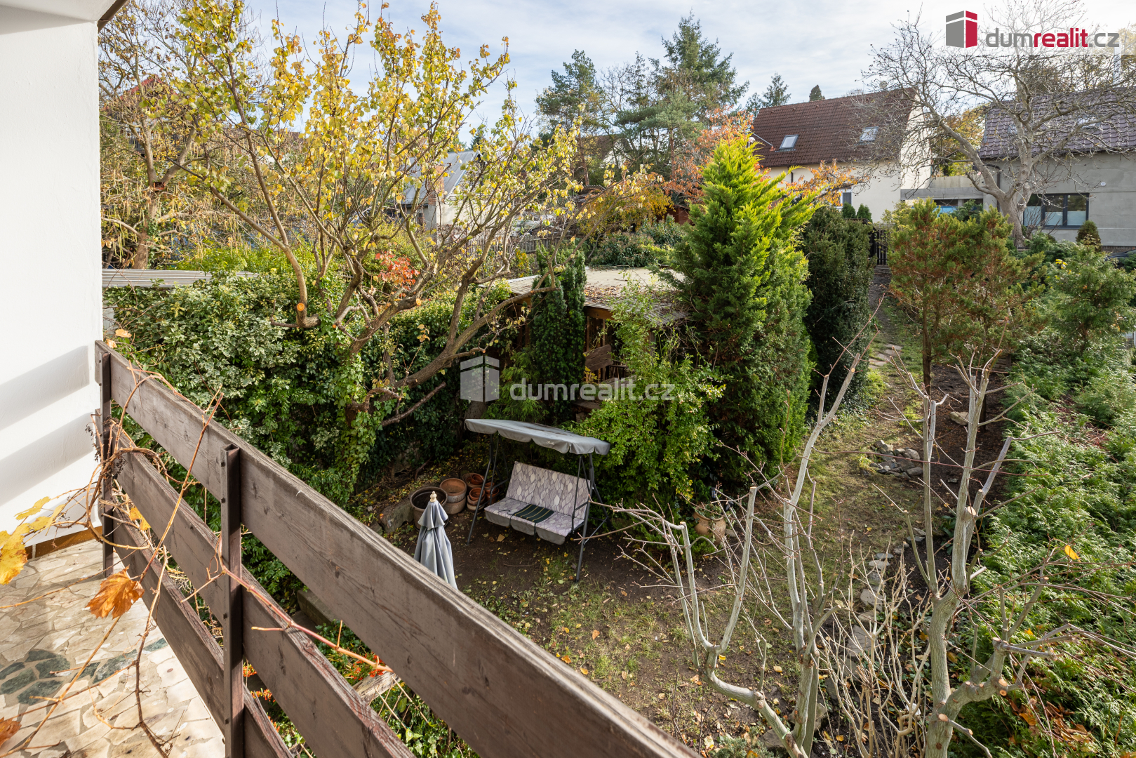 Ze zahrady se dá vyjít do ulice Na Vršku. A z vršku zahrady se dá rozhlédnout po přilehlých kopcích a střechách sousedních domů.