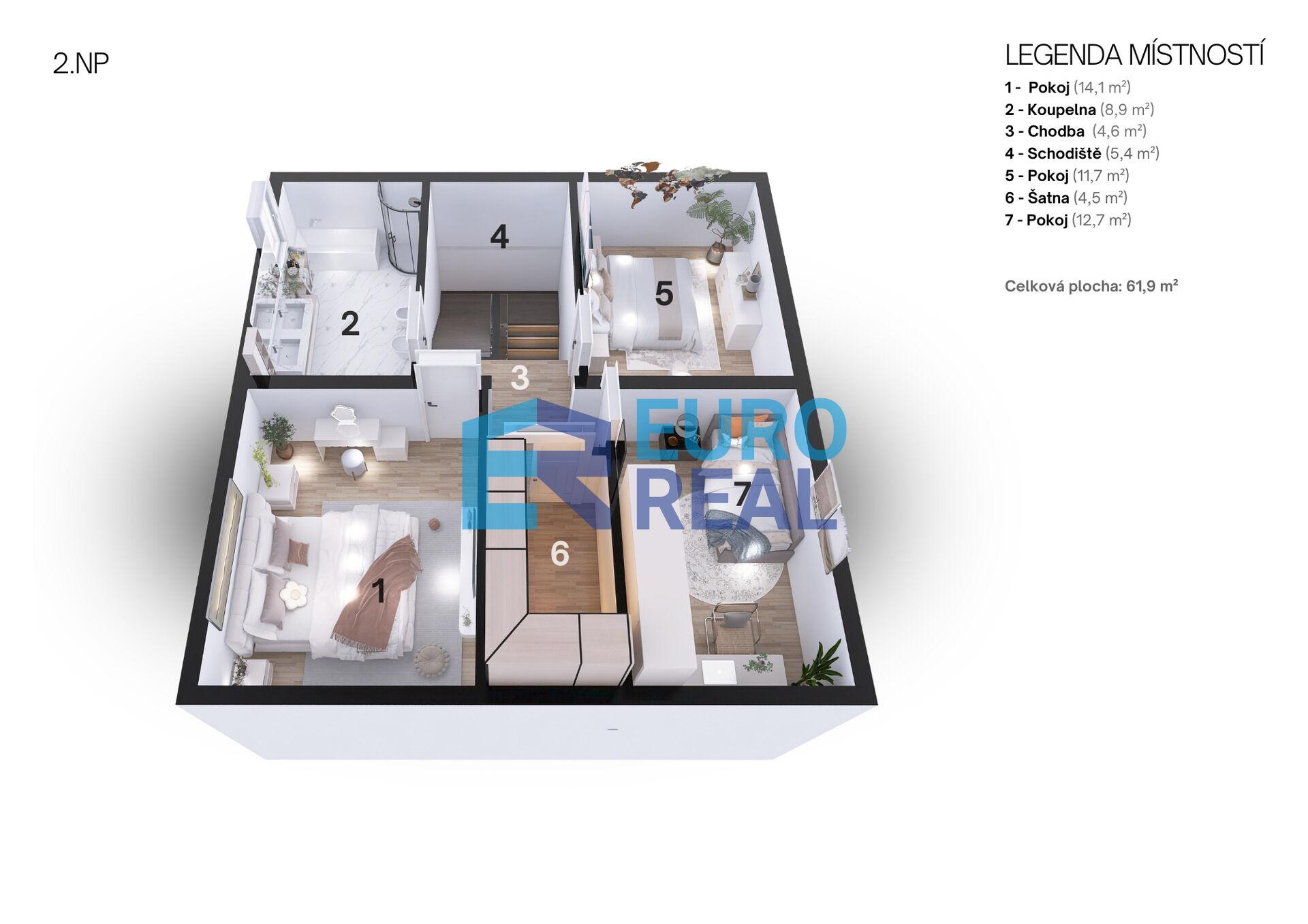 V prvním podlaží pak jsou 3 ložnice se společnou šatnou. V patře je také velká koupelna s vanou i sprchou a WC.