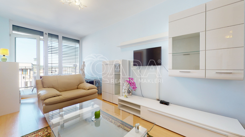 Byt je vybaven kompletně zařízením nábytkem, chybí jen pračka. Velká okna, která přináší spoustu světla, je možné odstínit venkovními žaluziemi.