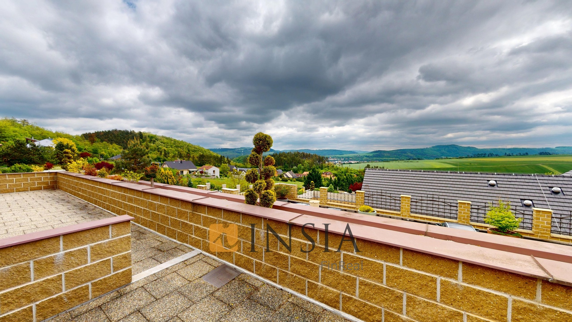 Horní podlaží nabízí světlé místnosti, terasy a balkony s výhledem do zeleně. Soukromé parkoviště pro osm vozů a dálkově ovládaná brána zajišťují naprosté soukromí a bezpečí. Žádní nezvaní hosté – jen klid, prostor a komfort.