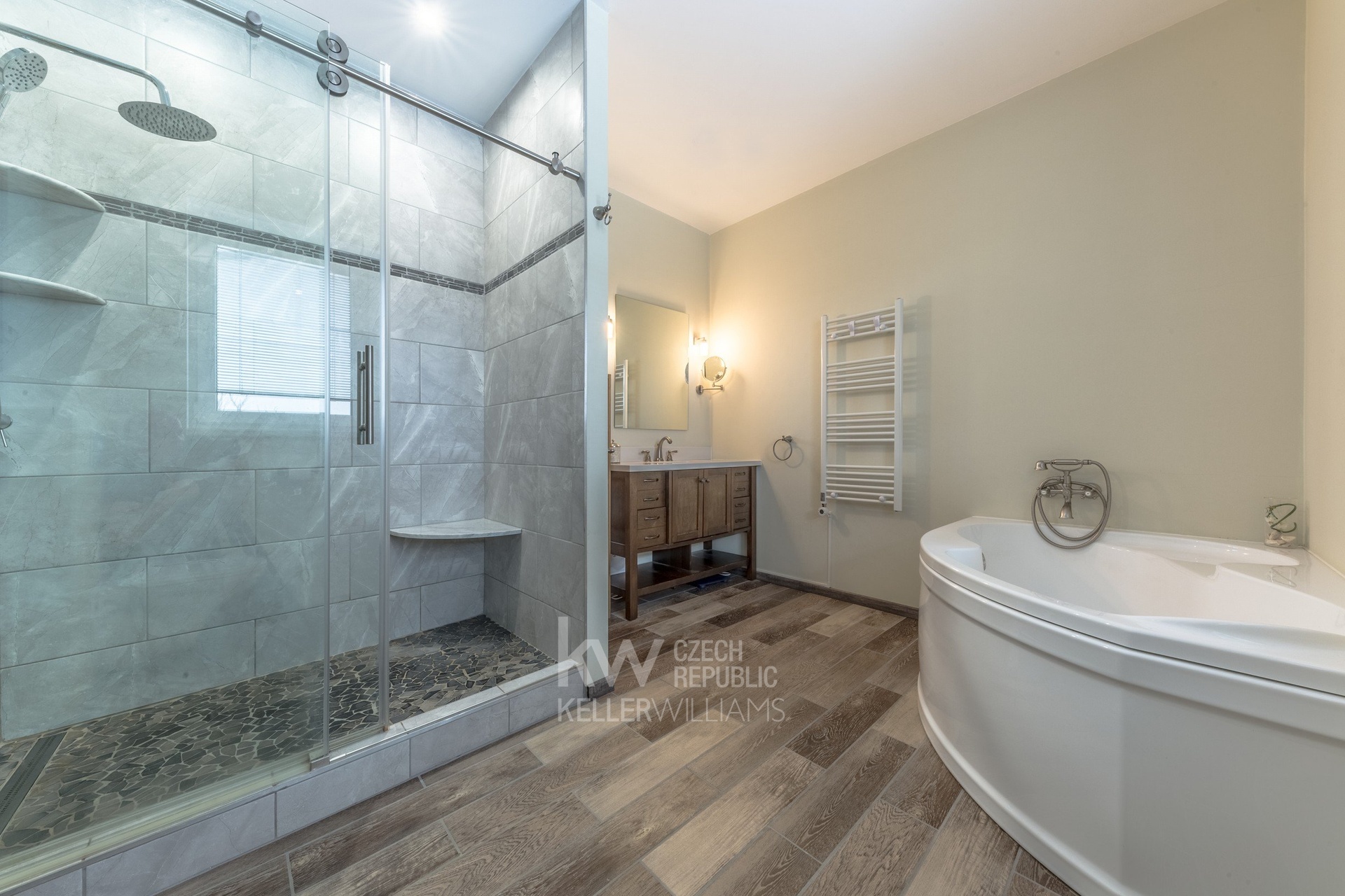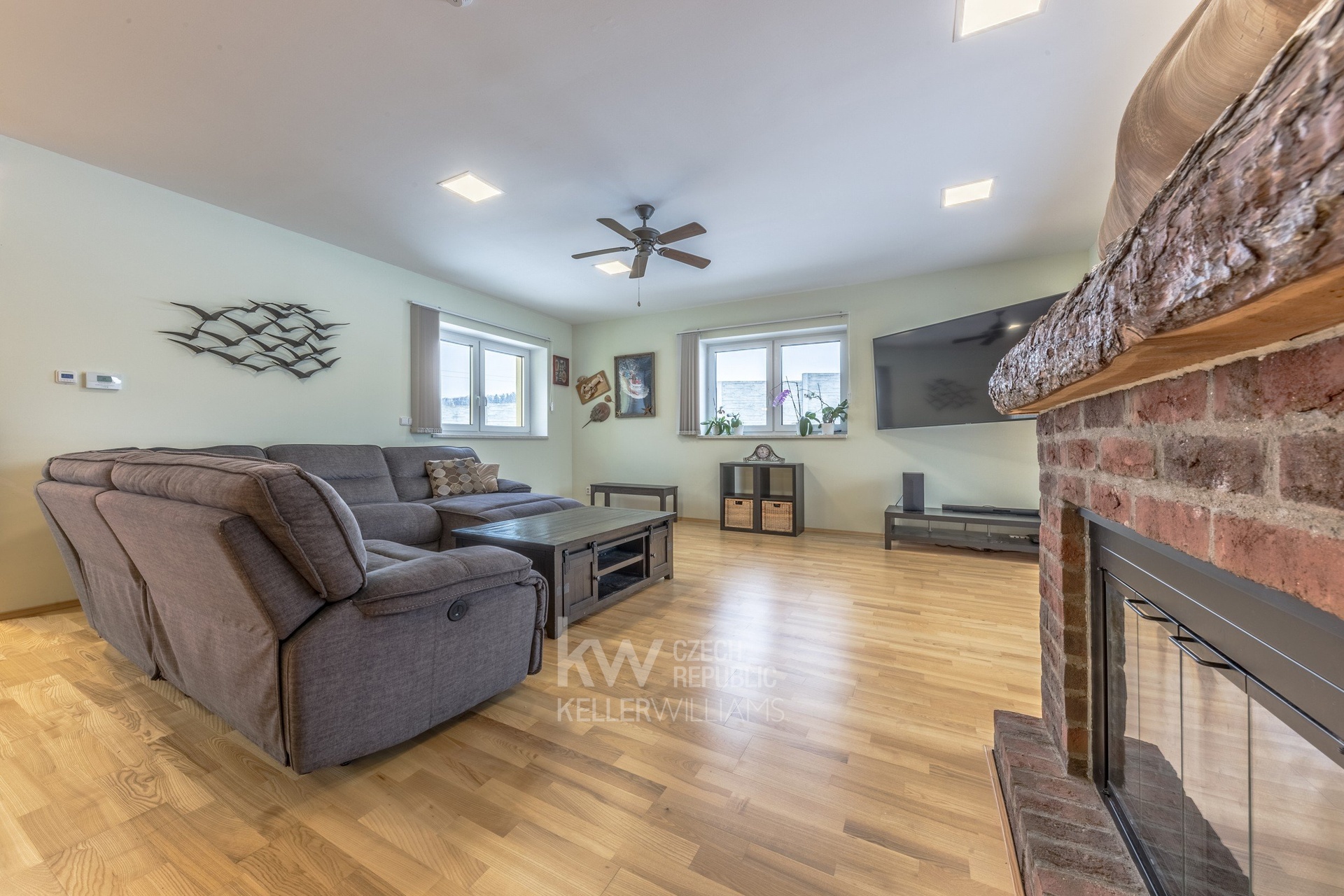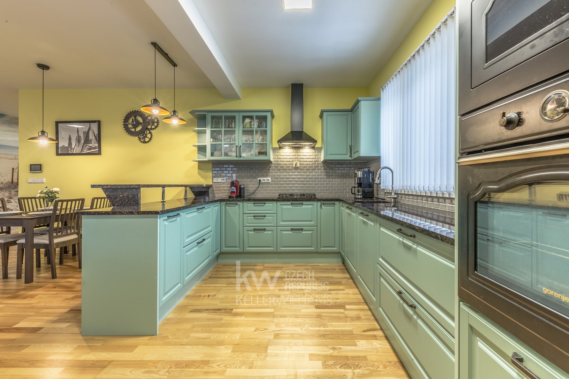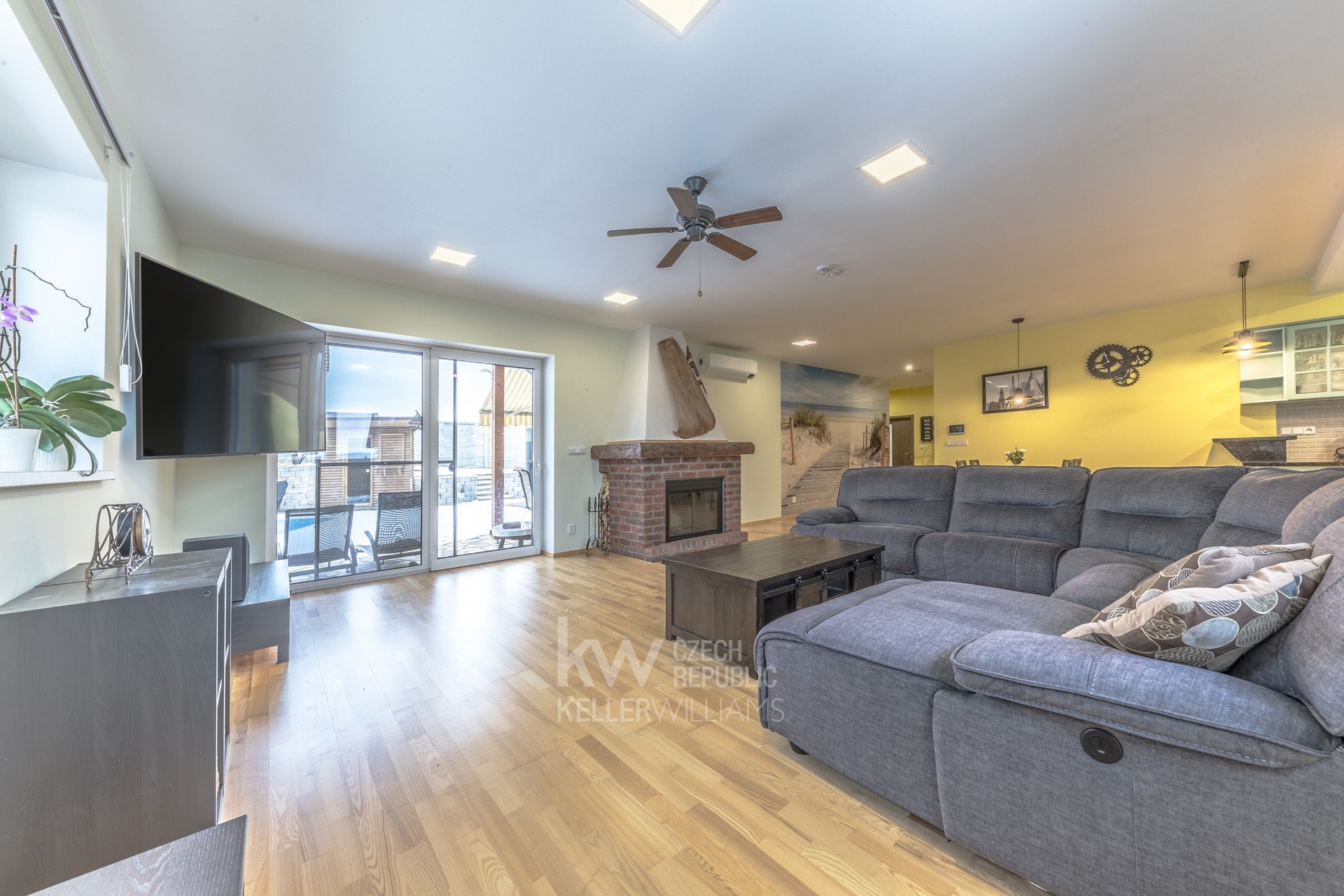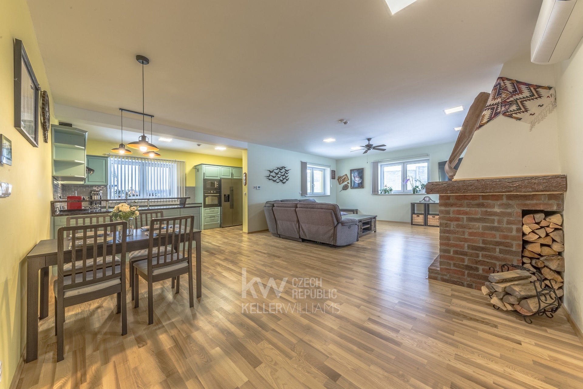 Srdcem domu je obývací prostor s kuchyní, který se pyšní úctyhodnou výměrou téměř 50 m². Zde se odehrává rodinný život, ať už u příjemného tepla praskajícího krbu, nebo při otevřených francouzských oknech směrem do zahrady k bazénu. Kuchyně je splněným snem každého milovníka vaření. Nejen díky žulové desce a kameninovému dřezu, ale především špičkovému vybavení. K dispozici jsou kvalitní vestavěné spotřebiče včetně drtiče odpadu a americké lednice s přímým napojením na vodu, takže ledové osvěžení máte vždy po ruce.