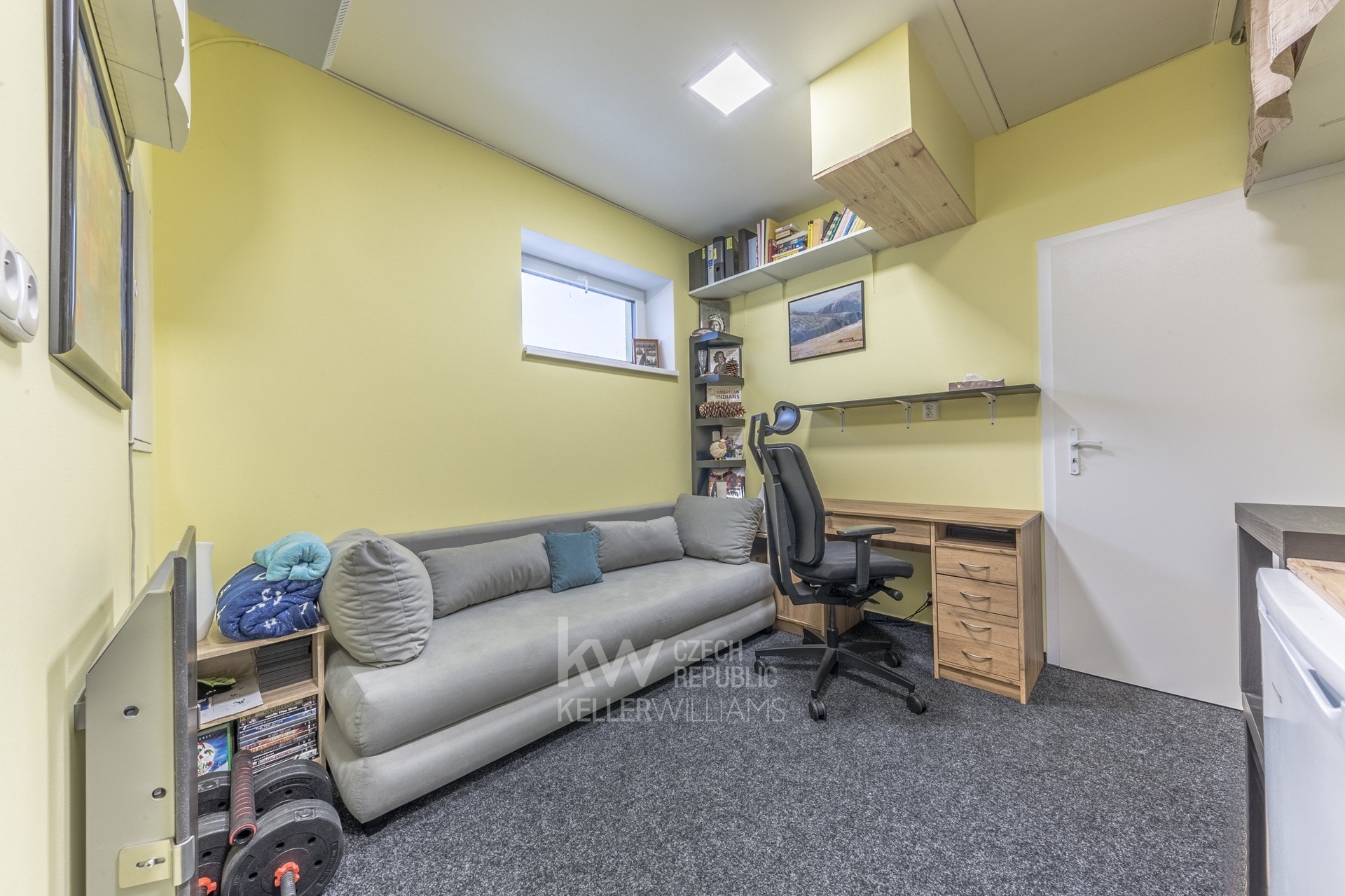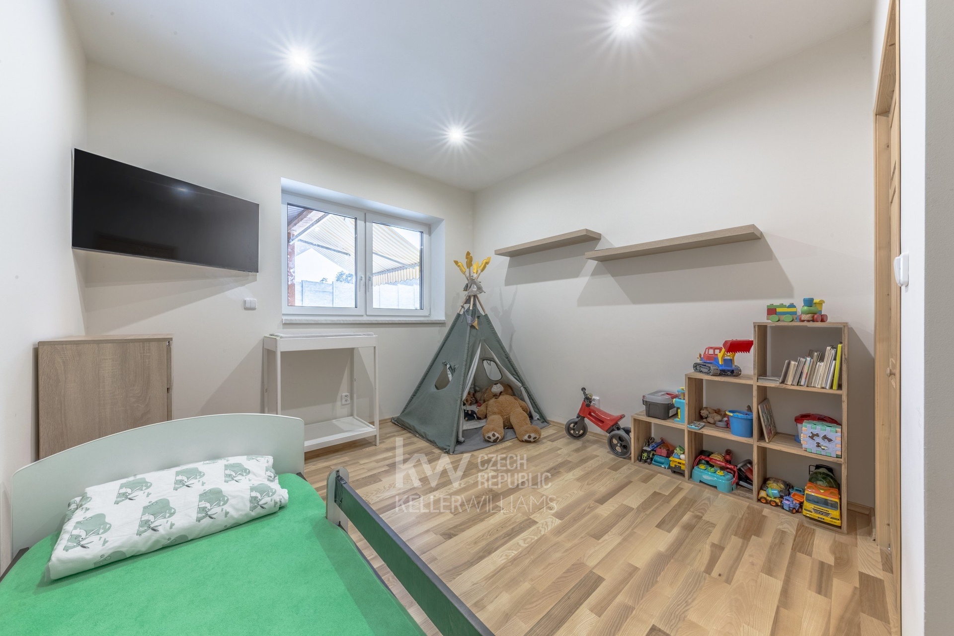 V klidové části domu naleznete hlavní ložnici, která nabízí skutečný luxus v podobě přímého vstupu k bazénu. Rannímu plavání tak nestojí nic v cestě. Dále je zde útulný dětský pokoj a pracovna (vznikla částečnou úpravou garáže), dvě elegantní koupelny a technická místnost.