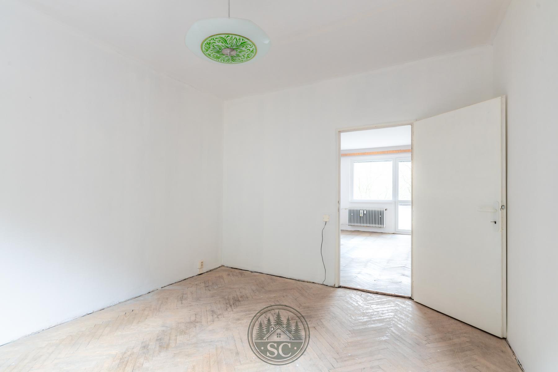 Byt se prodává nezařízený. Součástí inzerce jsou dvě vizualizace možného budoucího stavu bytu (nezobrazují skutečný stav).