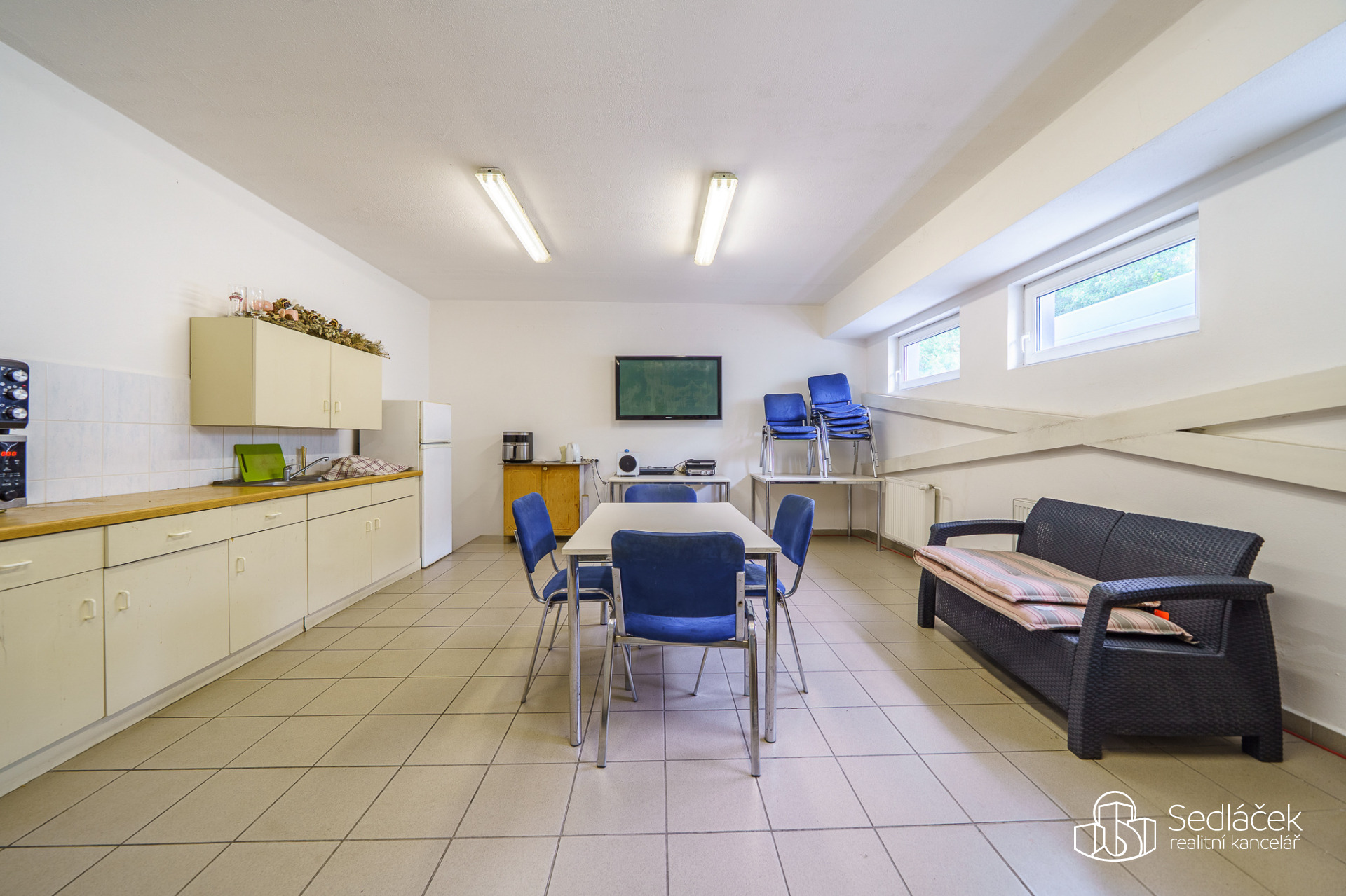 - Suterén (2 489 m²): kanceláře, šatny, sociální zázemí, kuchyňka, serverovna, kotelna, vrátnice