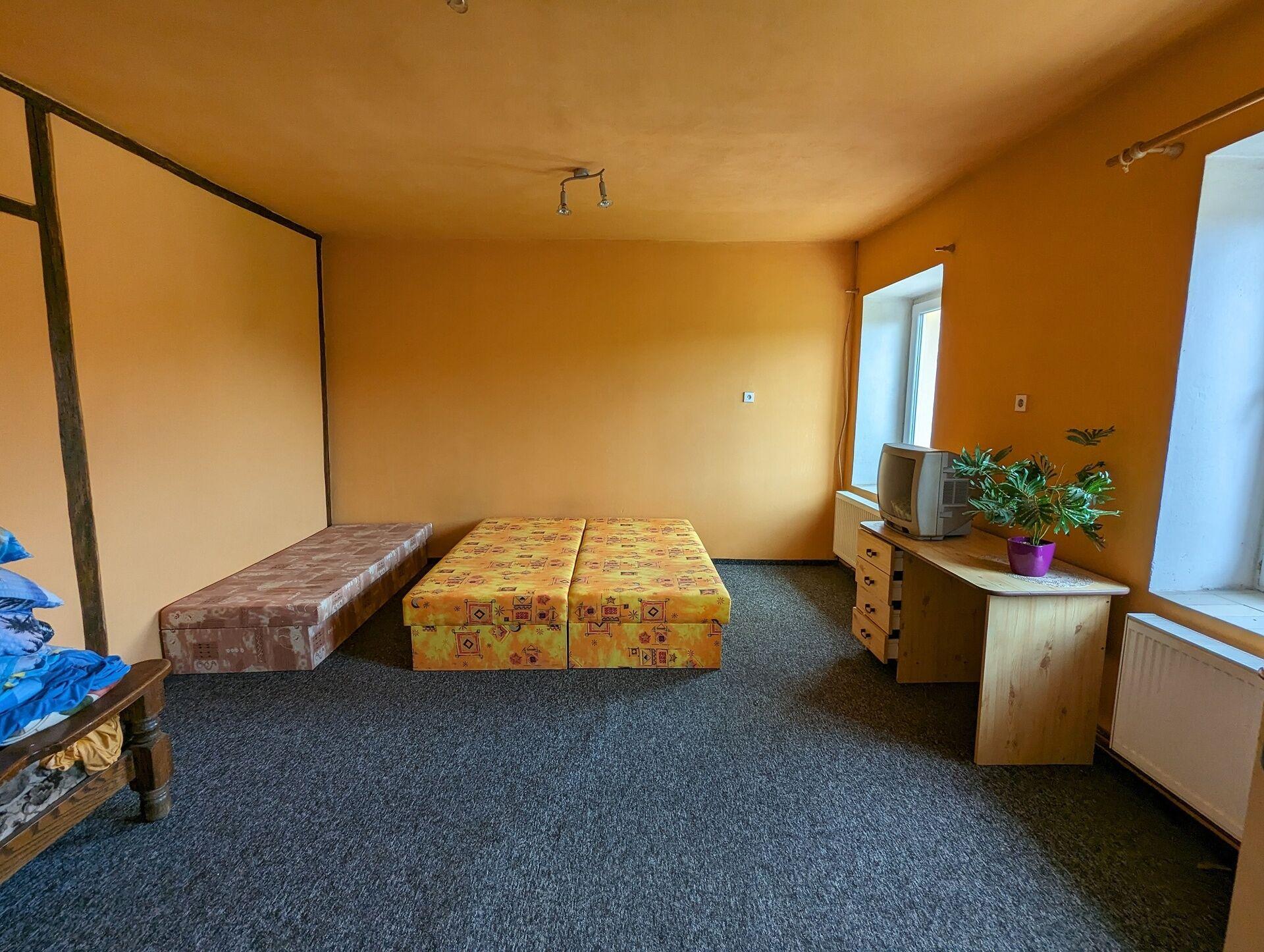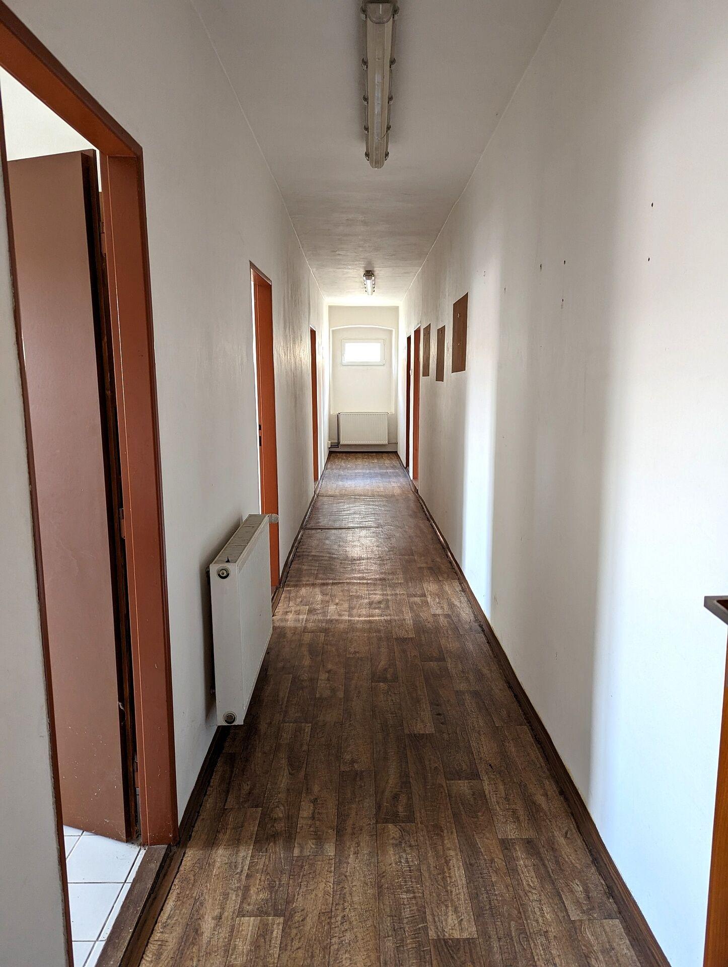 Hlavní dům o zastavěné ploše 340 m2 v 1. patře zahrnuje byt 4+KK s vlastní koupelnou a WC, byt 2+KK, 2 kanceláře, WC muži, WC ženy a koupelnu se sprchou.