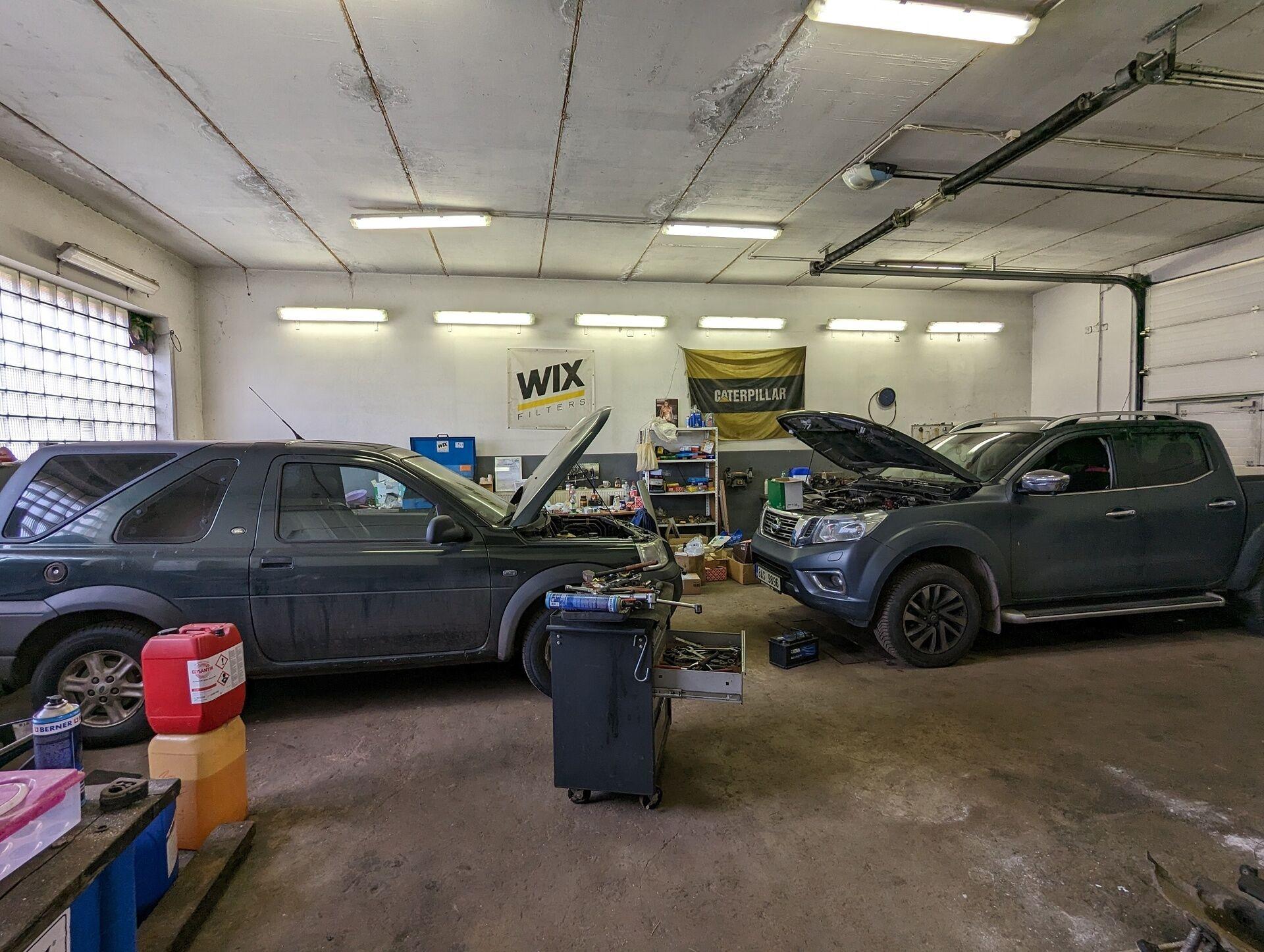 Budova garáží má zastavěnou plochu 330 m2. Světlá výška garáží je 3,88 m, vstup celkem 5 vraty, možno zaparkovat i dodávky a karavany, opravárenský kanál v podlaze.
