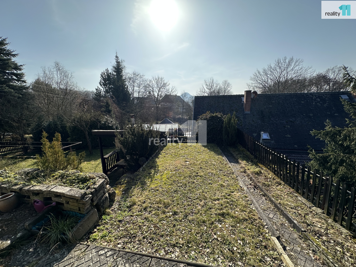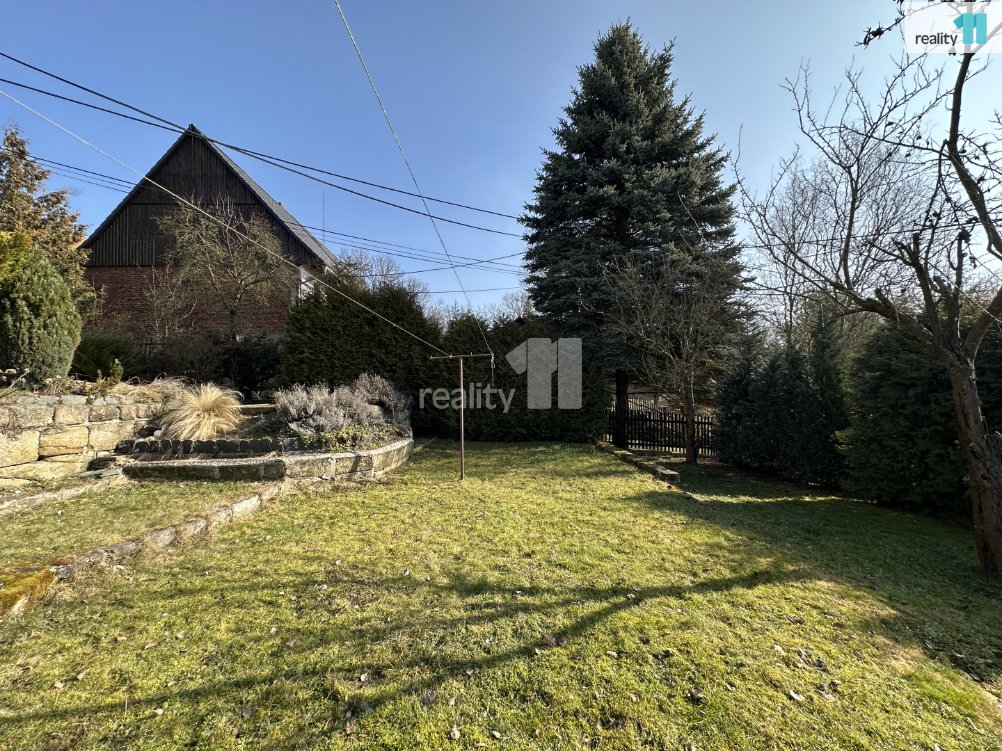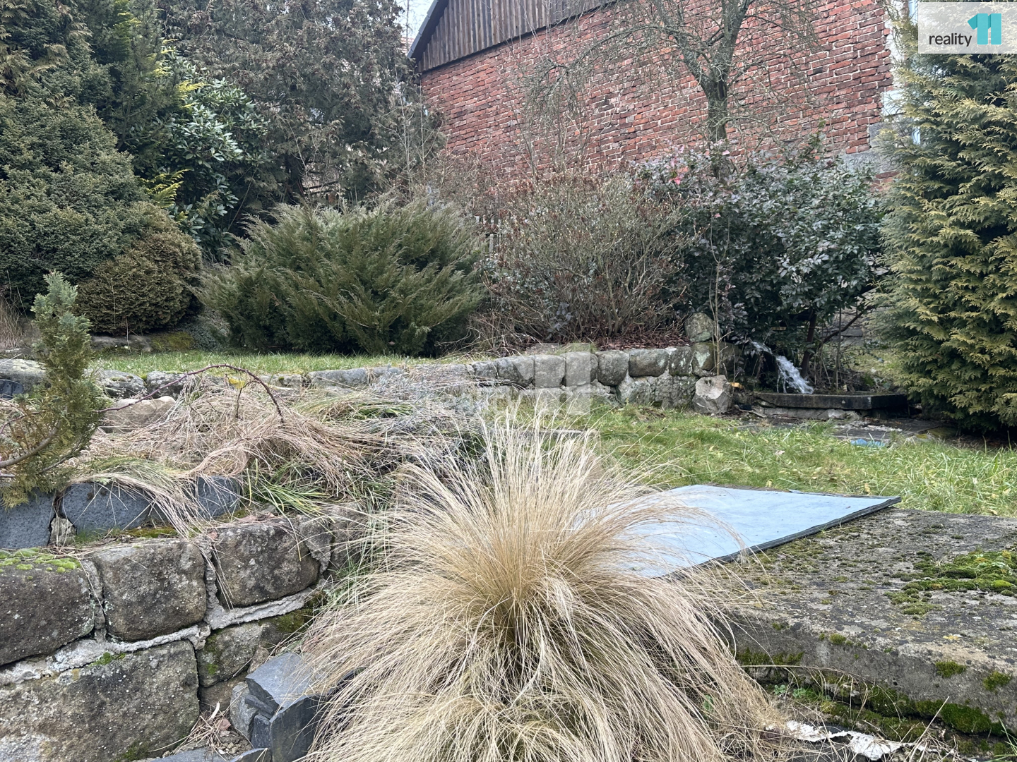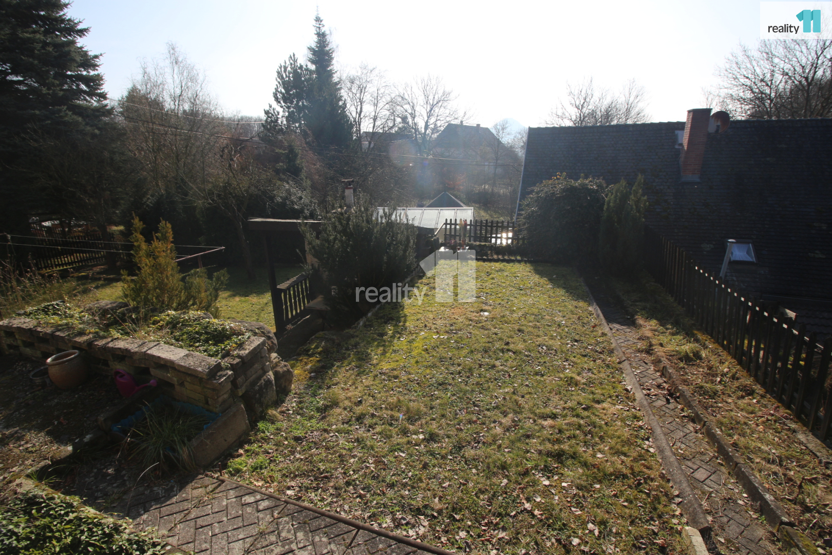 • Zahrada je svažitá, jsou zde ovocné stromy a Ořešák (vlašské ořechy).
