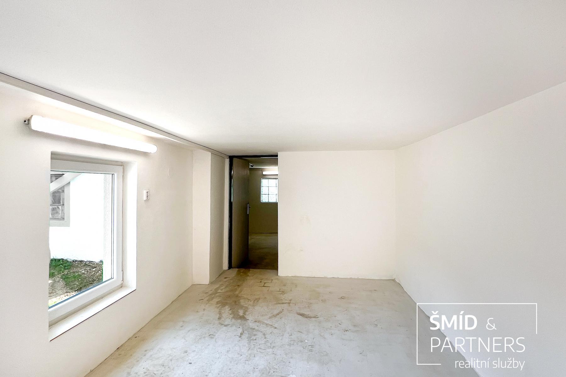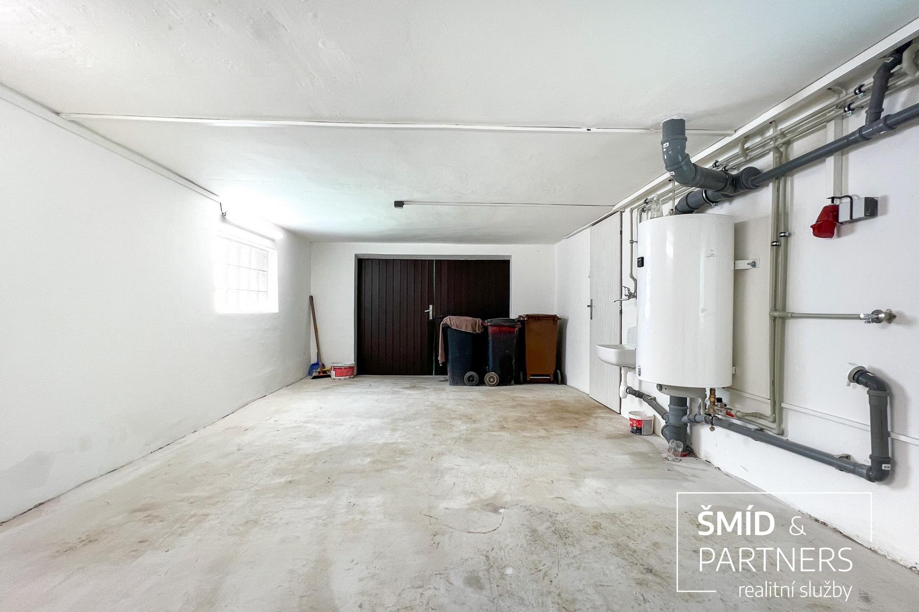 V přízemí se nalézá garáž s užitnou plochou 30m2 s vjezdovými vraty z ulice, dále sklad 14,4m2.