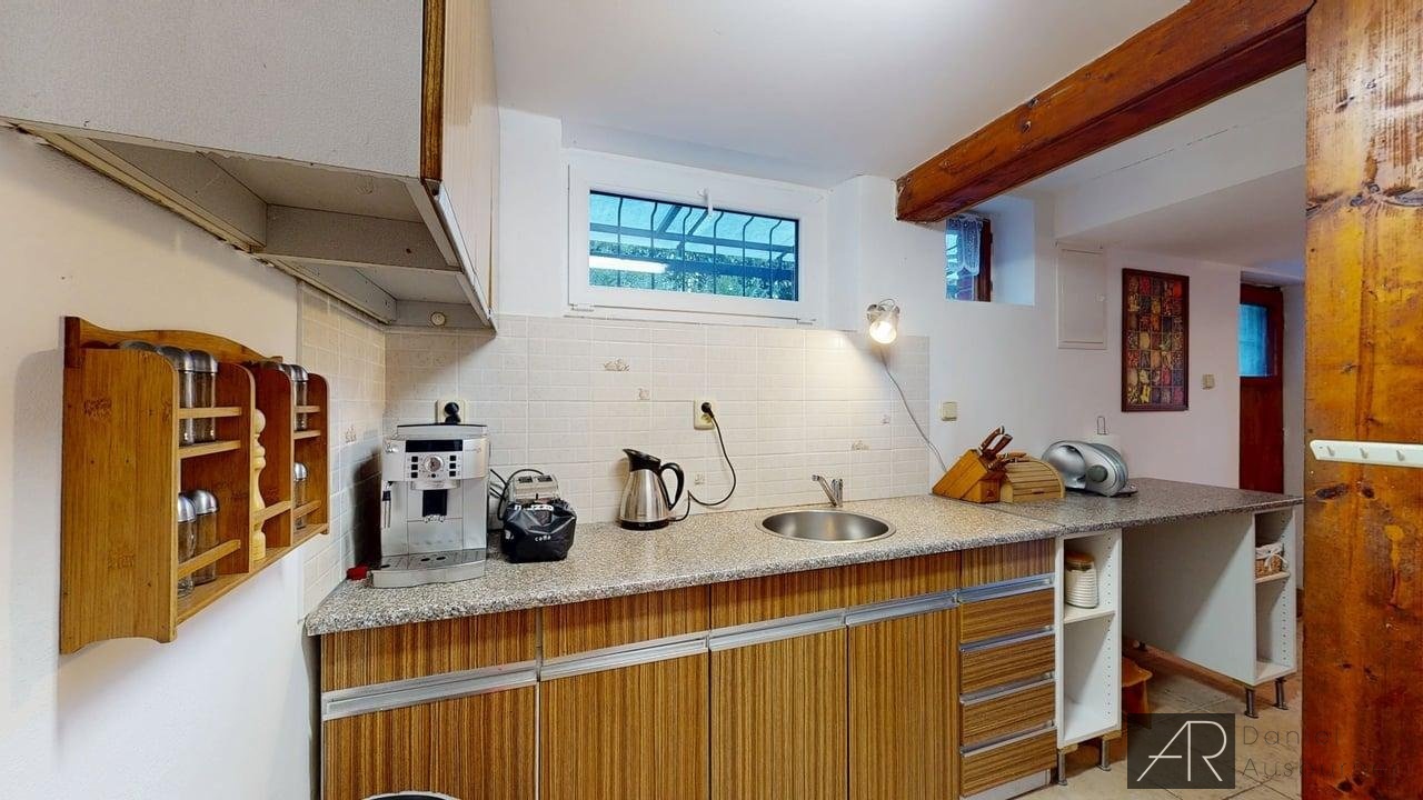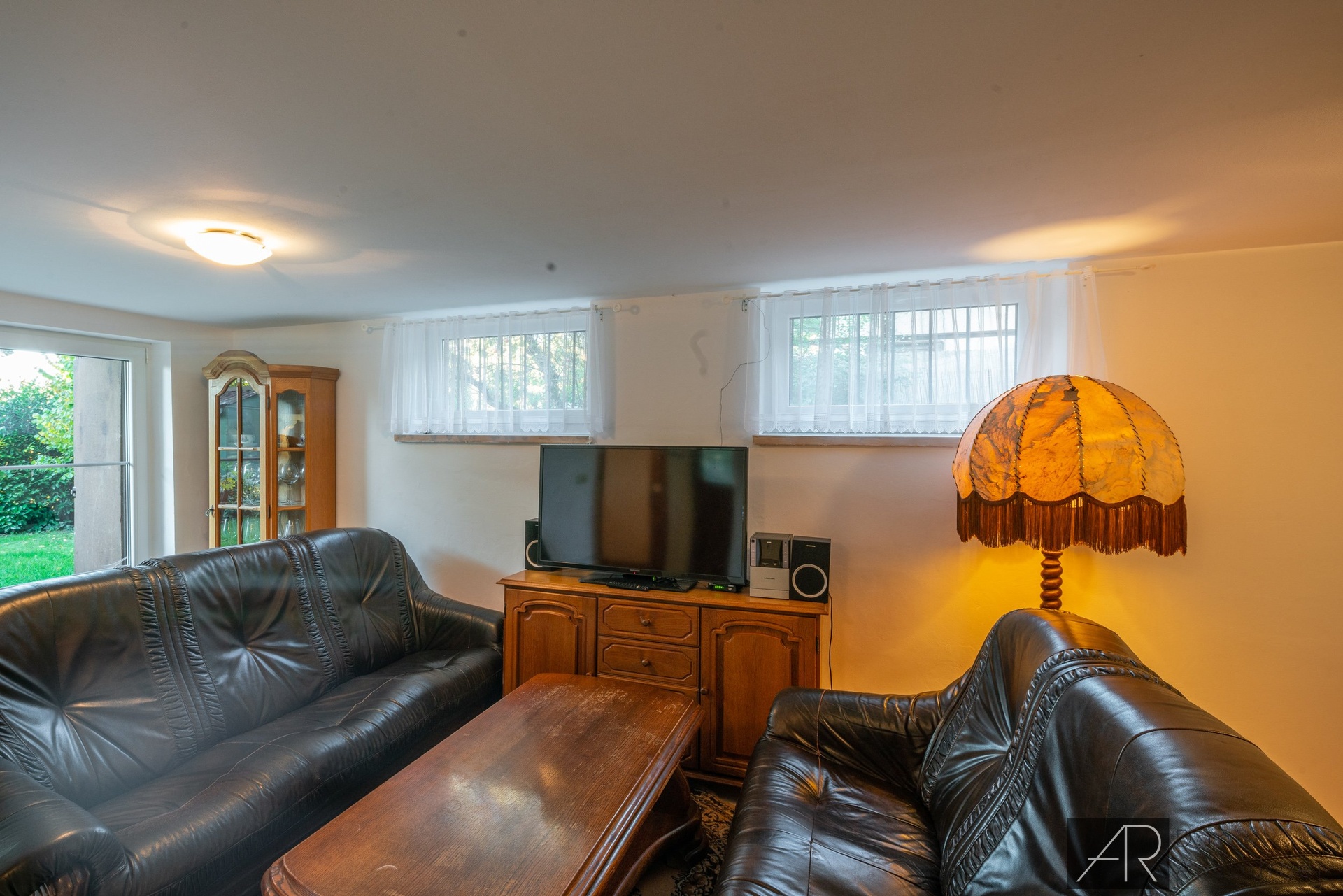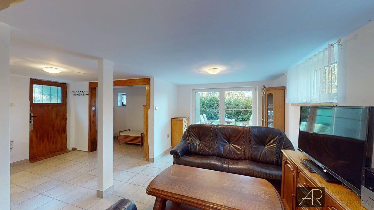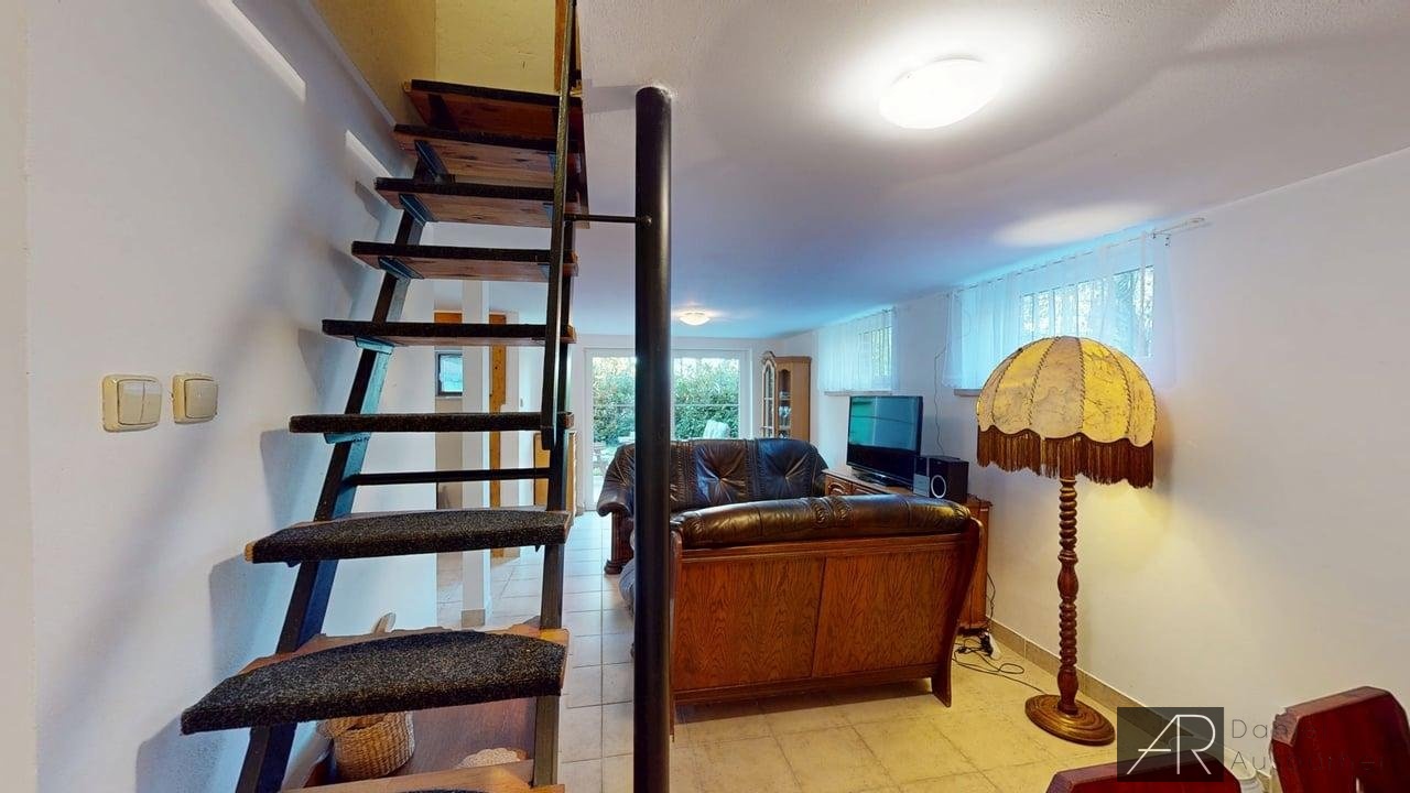Spodní zděné podlaží, se vstupem do zahrady, tvoří obývací pokoj s kuchyňským a jídelním koutem, koupelna s toaletou a komora.