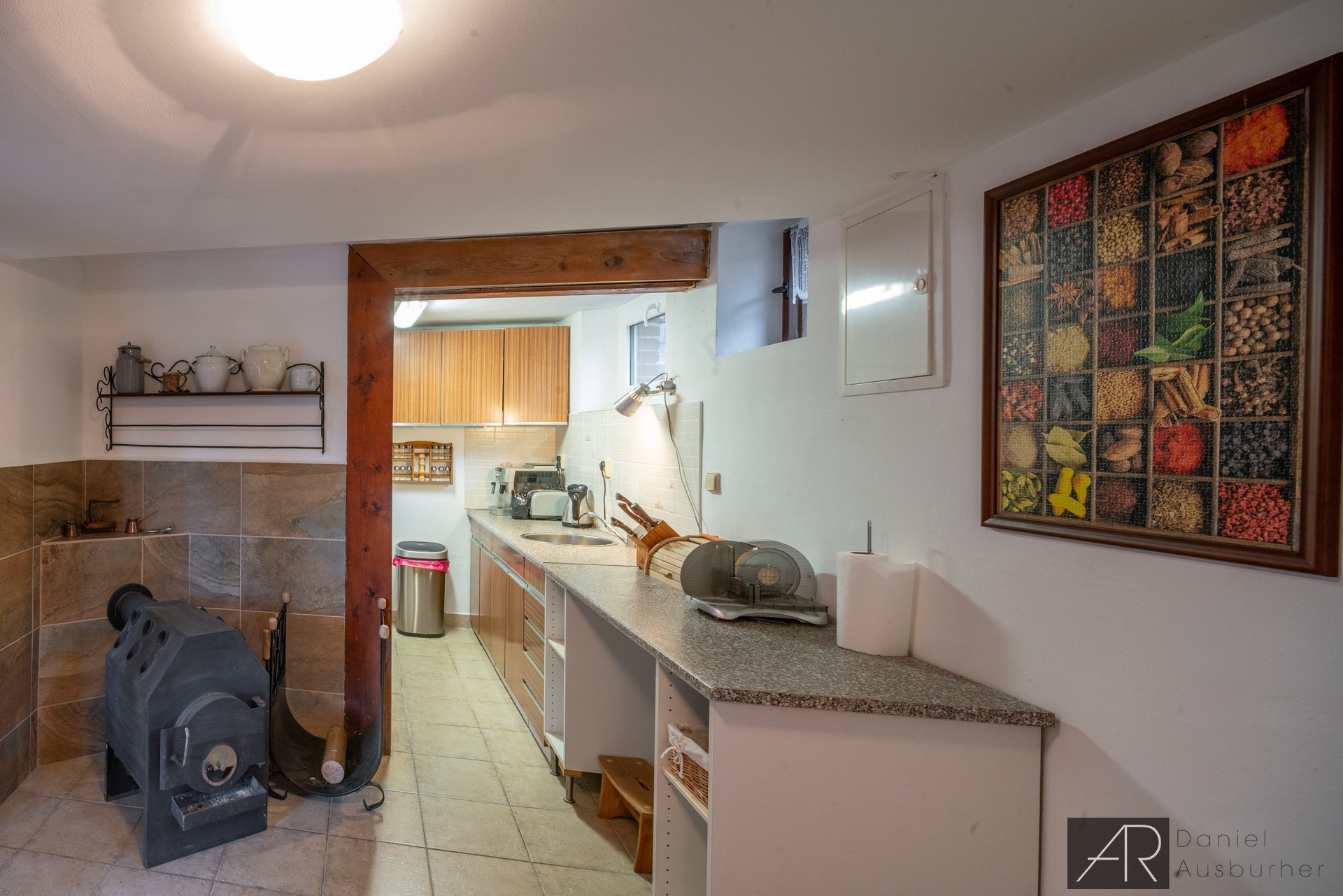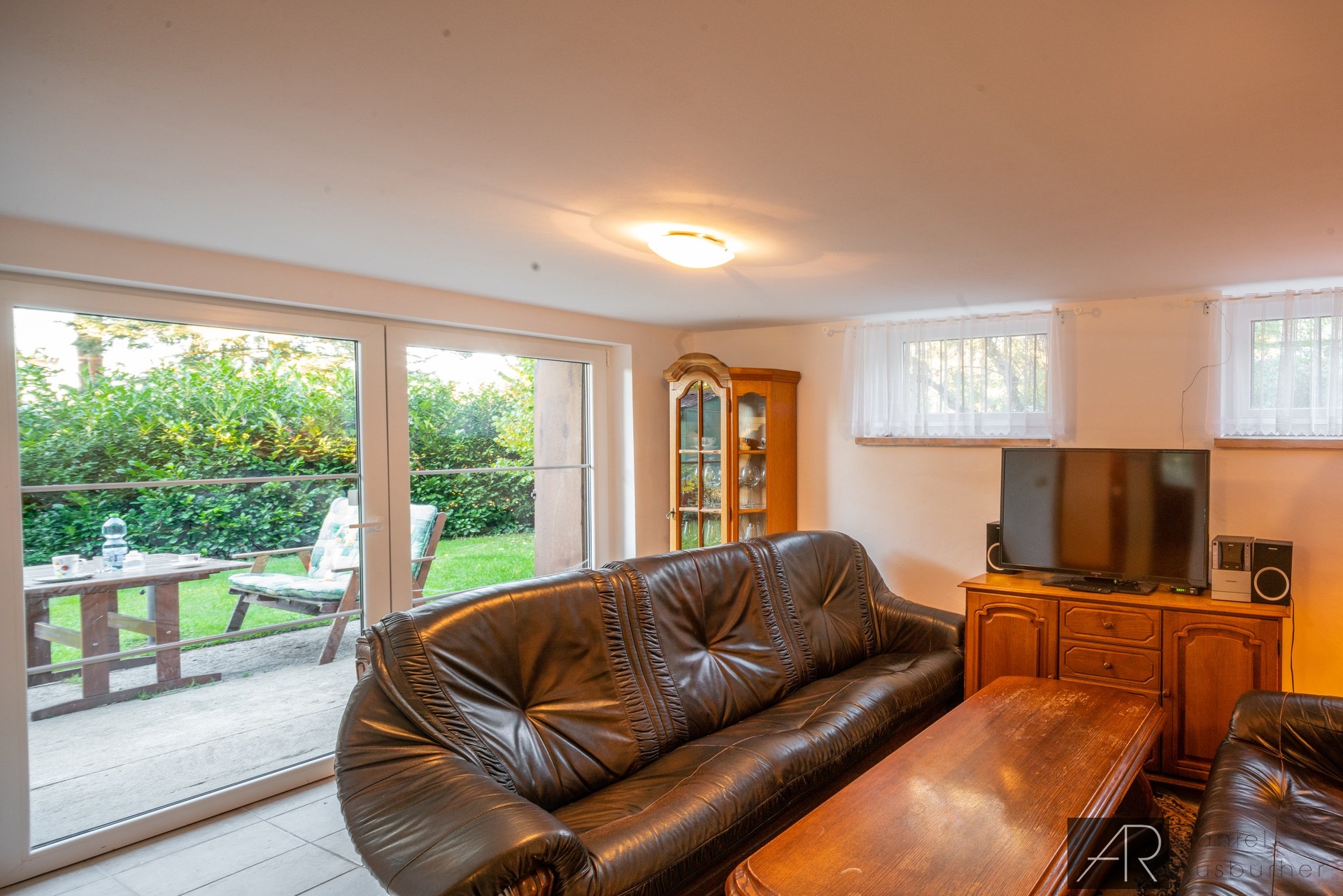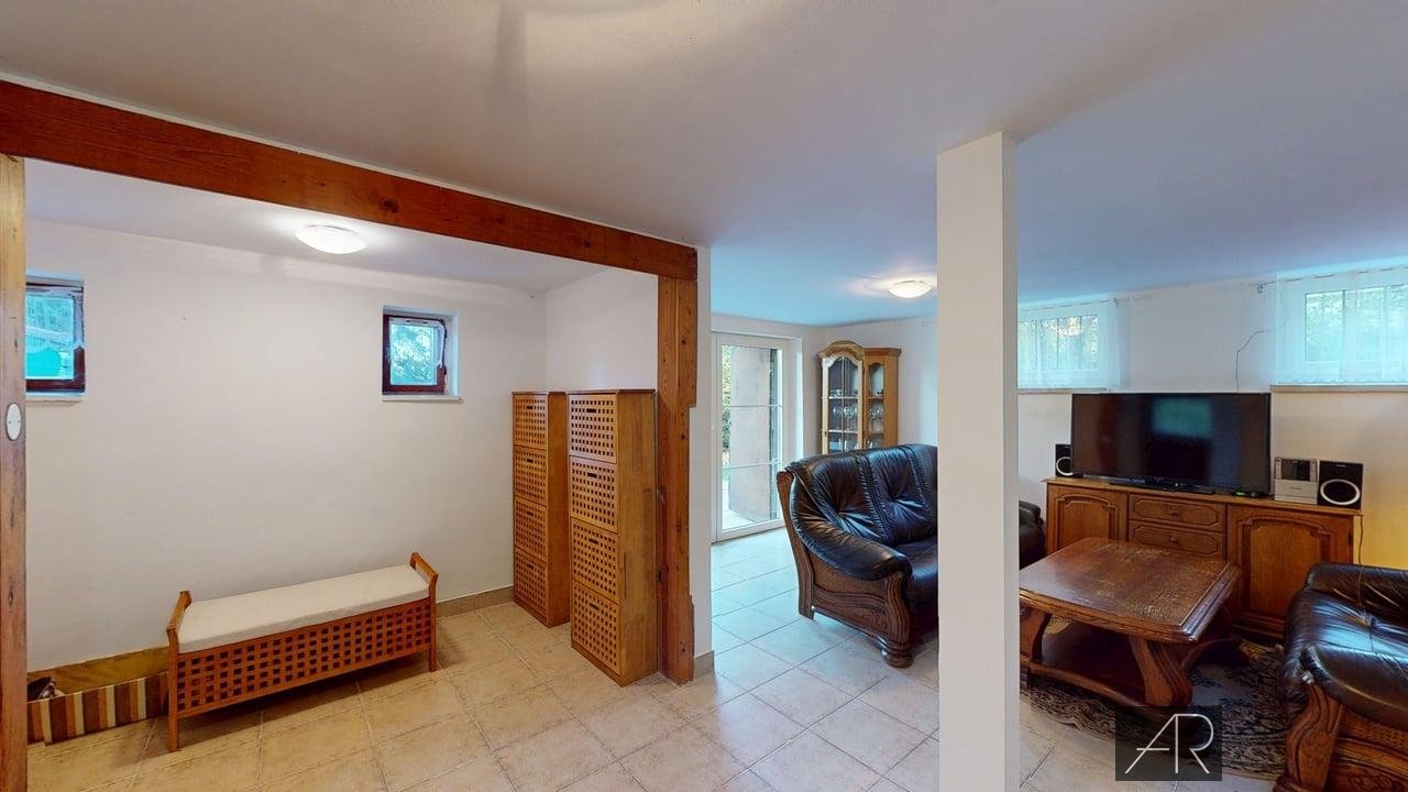 Spodní zděné podlaží, se vstupem do zahrady, tvoří obývací pokoj s kuchyňským a jídelním koutem, koupelna s toaletou a komora.