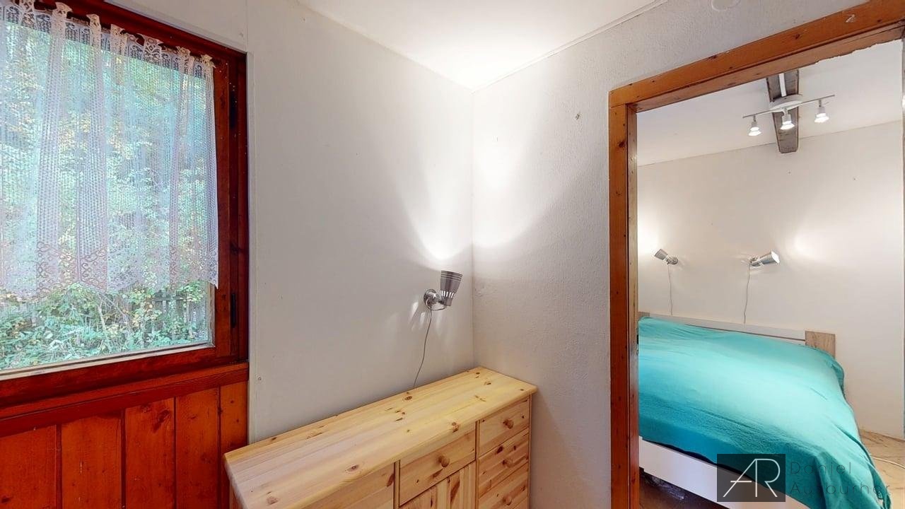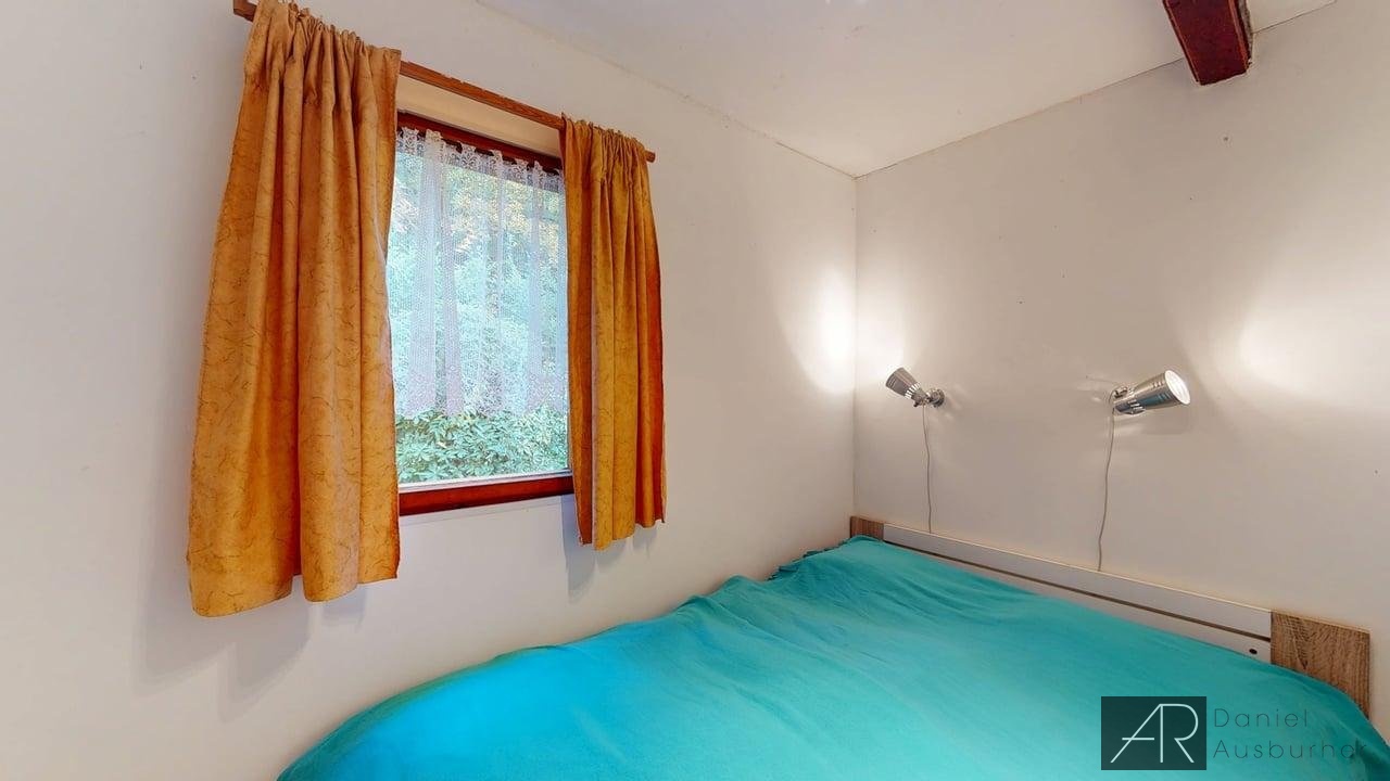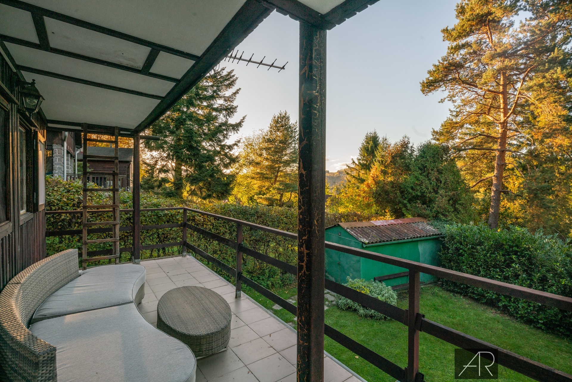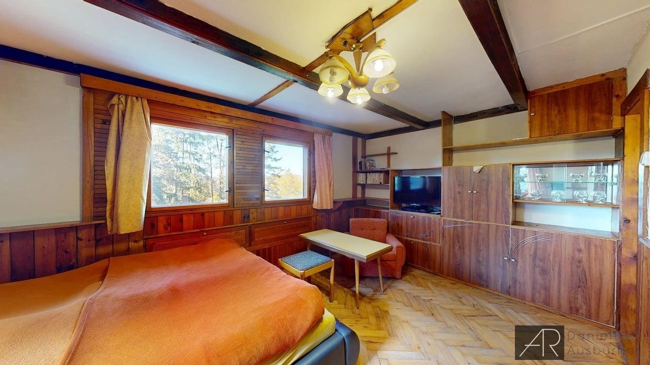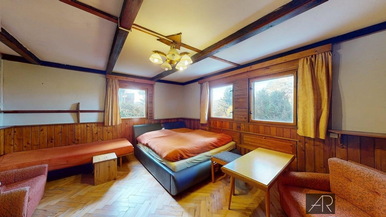 V horním, dřevěném podlaží se nacházejí dvě útulné ložnice a terasa s výhledem do zeleně.