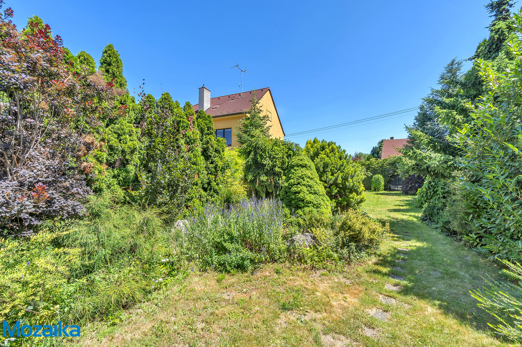 Za domem se nachází dlážděný dvorek s krytým posezením, králíkárnou a zapuštěným bazénem s pískovou filtrací (2 × 3 m, hloubka 80 cm). Odtud vstoupíte do dechberoucí zahrady, která je díky zdem a zeleným stěnám naprostým soukromým útočištěm.