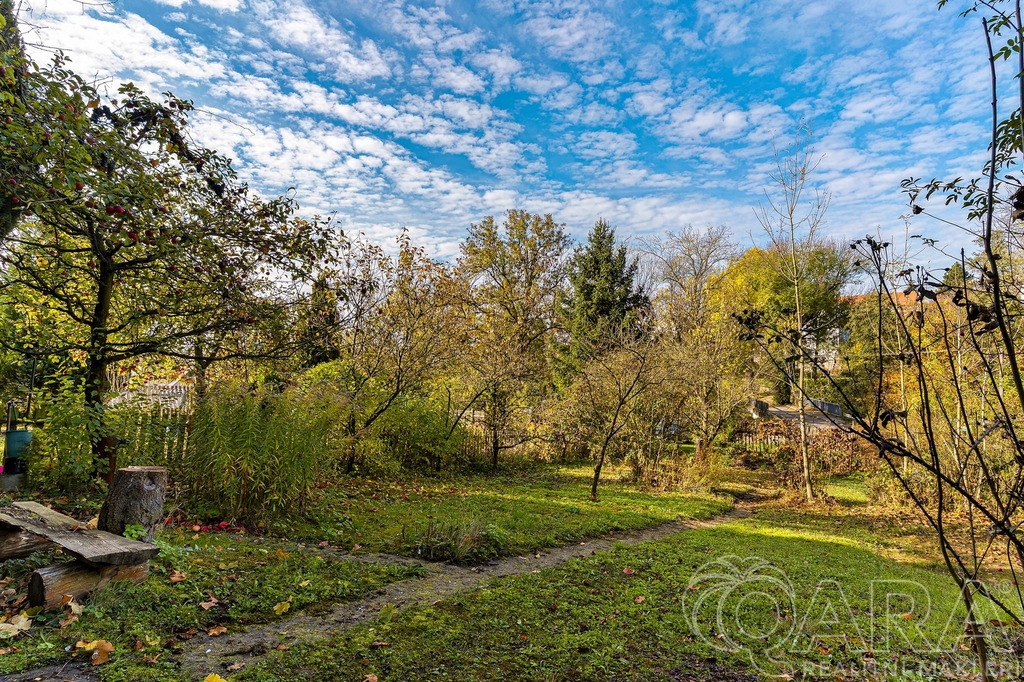 Zahrada je orientovaná na jih, mírně svažitá, s několika vyrovnanými místy vhodnými pro posezení se slunečníkem nebo bazének. Na hranici pozemku rostou ovocné stromy, především jabloně, a podél plotu vinná réva a ostružiny. Ze zahrady je příjemný výhled na protilehlý svah a přilehlou loučku, na které je nově vybudované dětské hřiště.