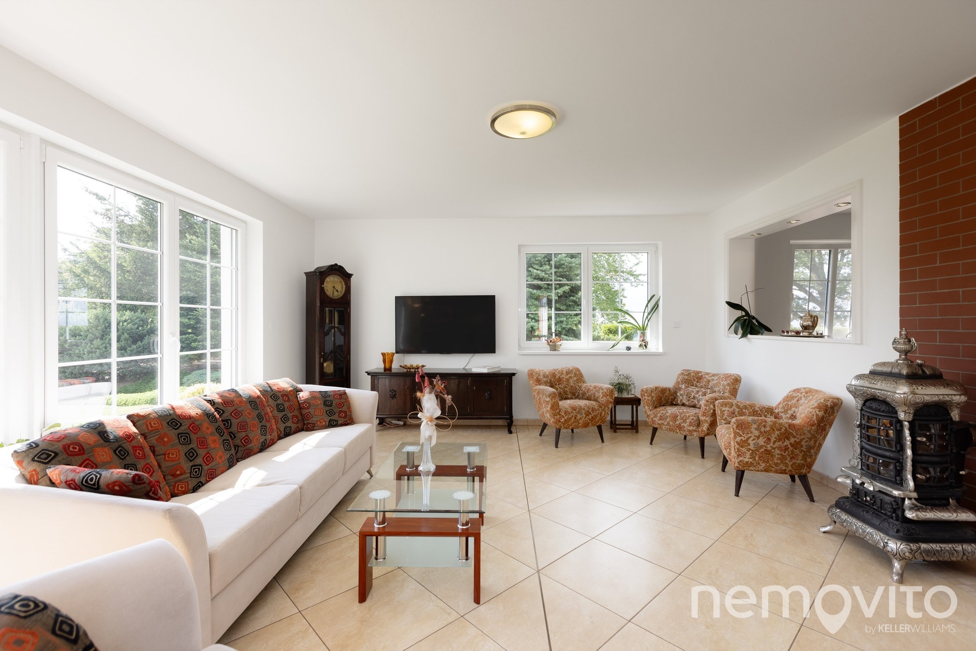 Dominantou prvního podlaží je obývací prostor s průhledem do prostoru s vnitřním bazénem. Zhruba 60 m2 v sobě spojuje prostor pro posezení, jídelnu a kuchyni. Společným jmenovatelem prvního podlaží jsou velká okna, která zejména v prostoru obýváku s kamny poskytují příjemné výhledy do zelené zahrady. Ačkoliv je kuchyně původní, je mimořádně zachovalá, kvalitní (Technistone) a také prostorná (linka do tvaru U s průhledem do obýváku). Prostor pro jídelnu je umístěný u průhledu k bazénu v části s výstupem na terasu.