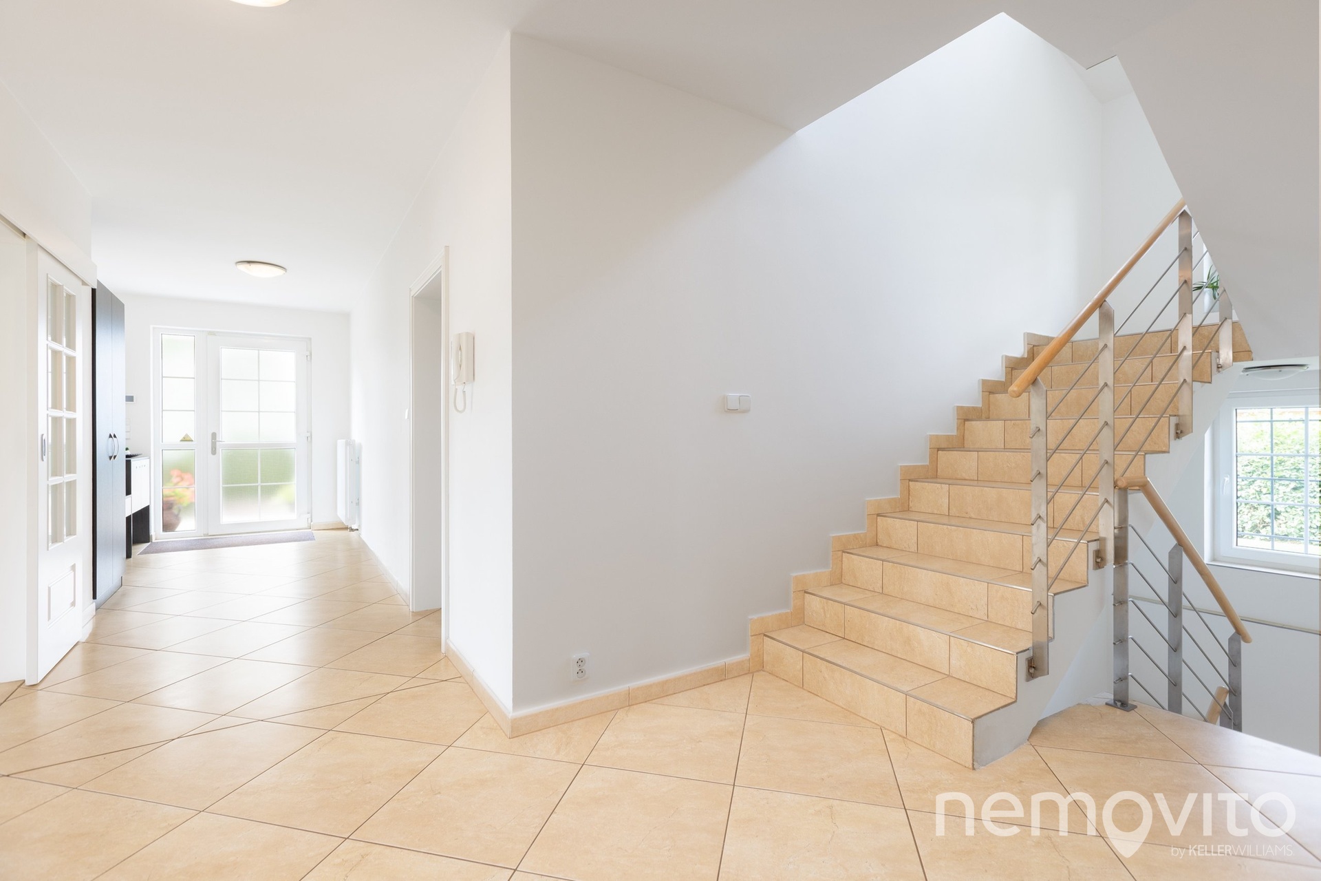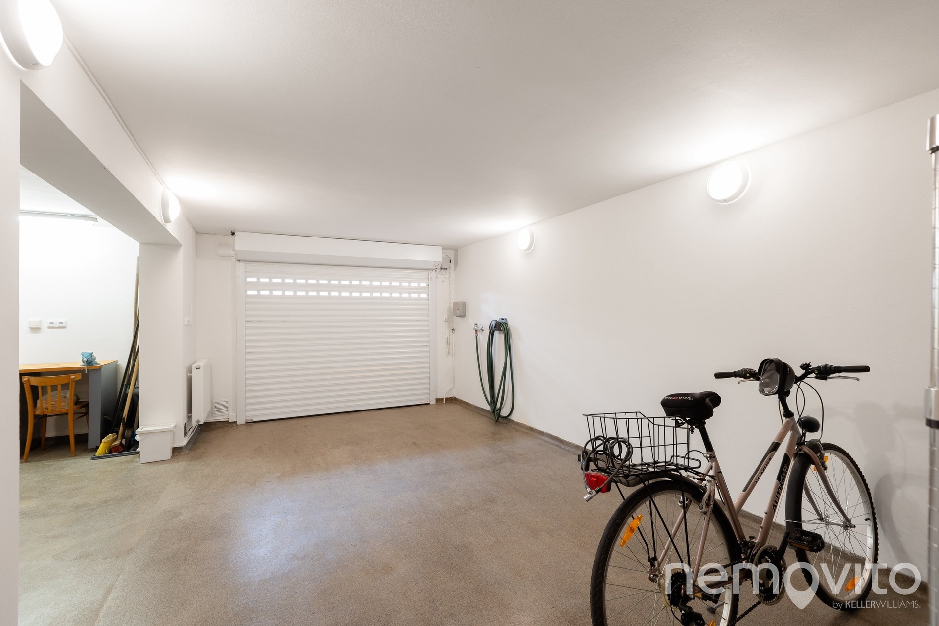 Suterén domu (74 m2) nabízí velkou technickou místnost (jednotka tepelného čerpadla, zásobník na teplou vodu a zázemí k bazénu), dále dva skladovací prostory na chodbě a velkou garáž. Ta je rozdělena na prostor pro auto a dílnu (35 m2), auta však pohodlně zaparkujete na ploše před domem, kam se bez potíží vejde 5 vozů. Velký rovinatý pozemek o velikosti 2.582 m2 je vybaven dvěma studnami a soustavou nádrží na dešťovou vodu. V jeho jižní části se nachází několik vzrostlých stromů a rovněž prostor pro užitkovou část zahrady, která však jinak plní funkci okrasnou.