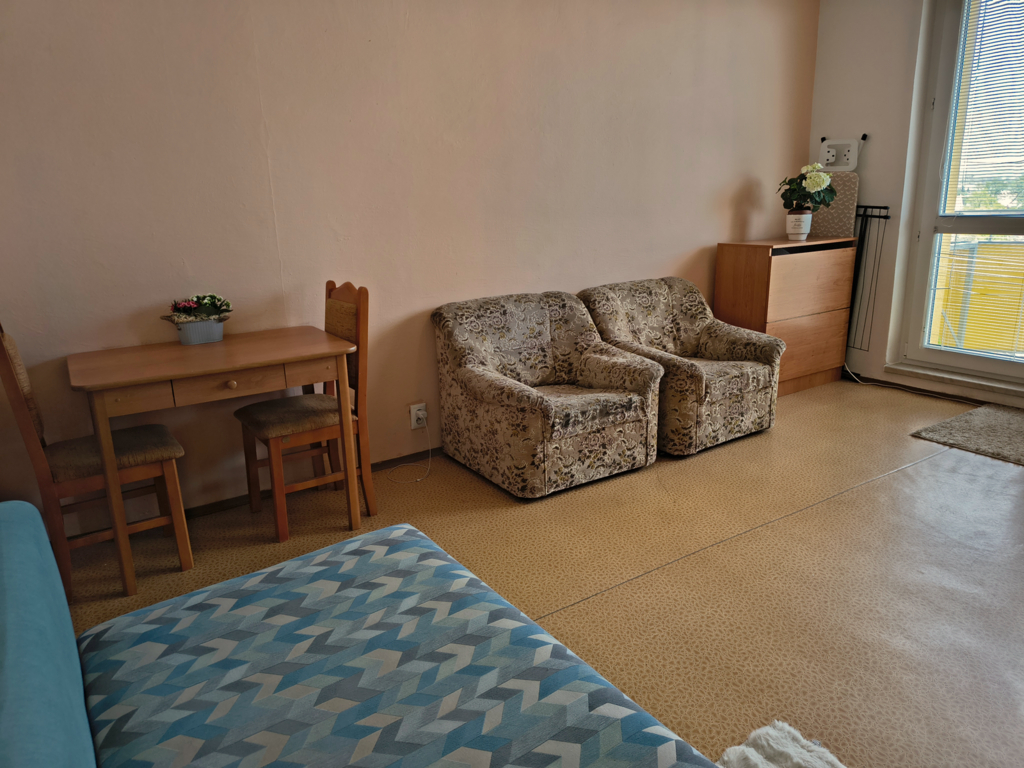Dispozice bytu nabízí vstupní chodbu s dostatkem prostoru pro skříně, zděnou koupelnu se sprchovým koutem, toaletou, umyvadlem a prostorem pro pračku. Hlavní obytný prostor je řešen jako obývací pokoj s kuchyňským koutem a přímým vstupem na balkon, který poskytuje příjemný, ničím nerušený výhled. Byt se prodává včetně vybavení, což umožňuje okamžité využití bez dalších investic.