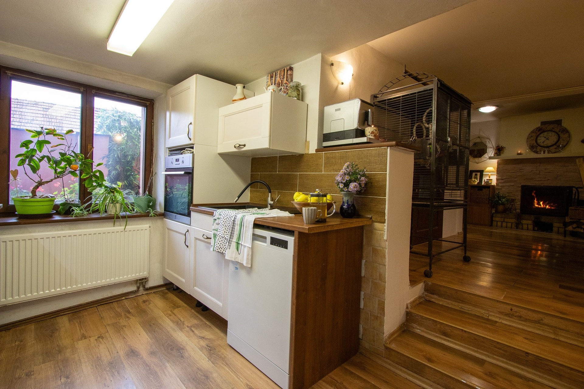 Vstup do domu Vás uvítá slunečnou chodbou, která Vás zavede do prostorného obývacího pokoje s ručně tkaným kobercem a impozantními akvárii, které dotvářejí originální atmosféru prostoru. Krb obložený umělým pískovcem přináší teplo domova a díky průduchům do patra a kombinaci vytápění je docíleno nízkých nákladů na provoz.