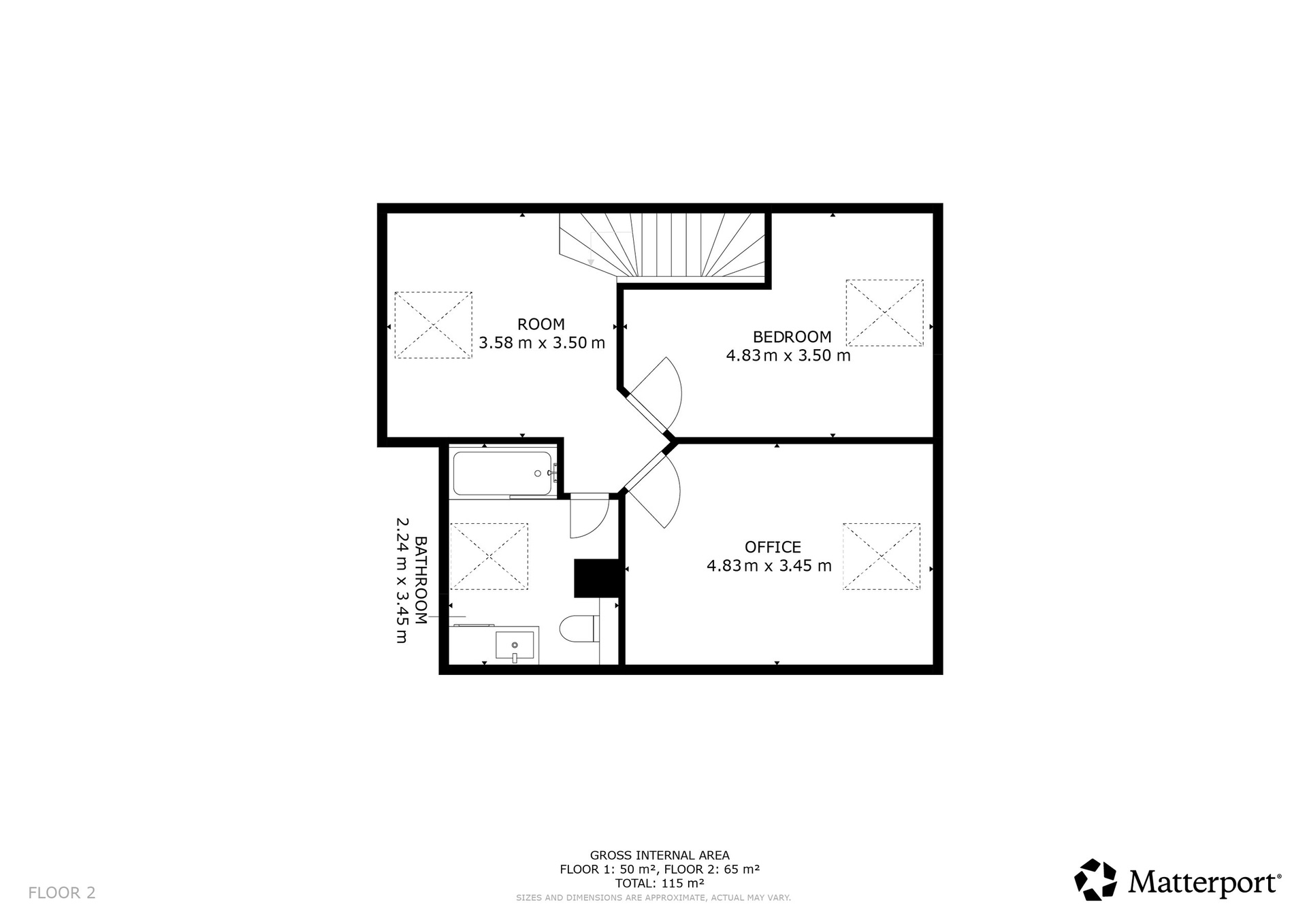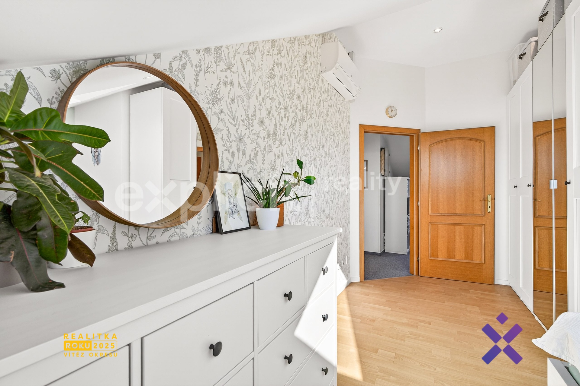 V horním patře jsou situovány další tři místnosti – ložnice, pokoj a pracovna se šatnou. Součástí patra je také prostorná koupelna s vanou a druhou toaletou.