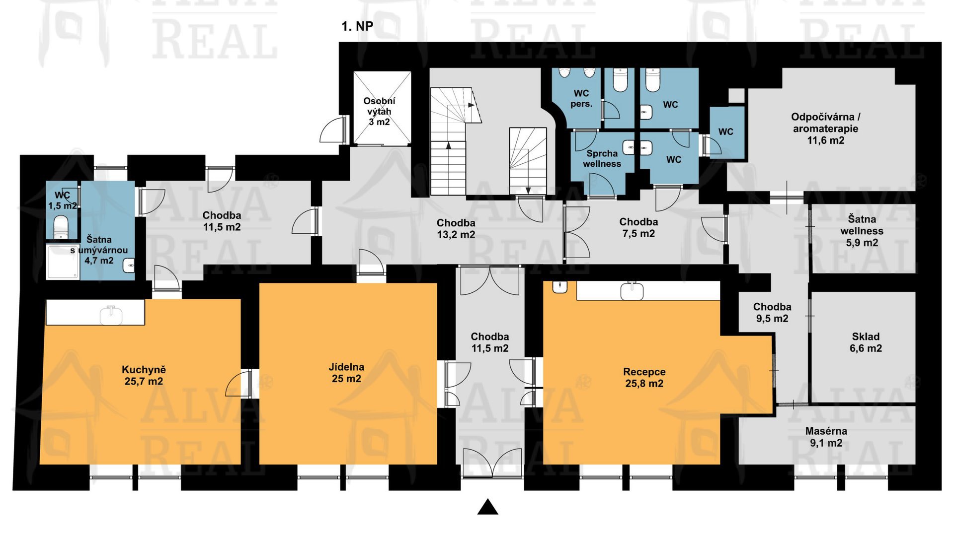 1.NP: vstupní chodba, recepce hotelu, masérna, místnost pro aromaterapii, šatny pro wellness, WC, sprchy, sklad, zázemí pro personál, kuchyně pro přípravu snídaní pro hosty, jídelna.