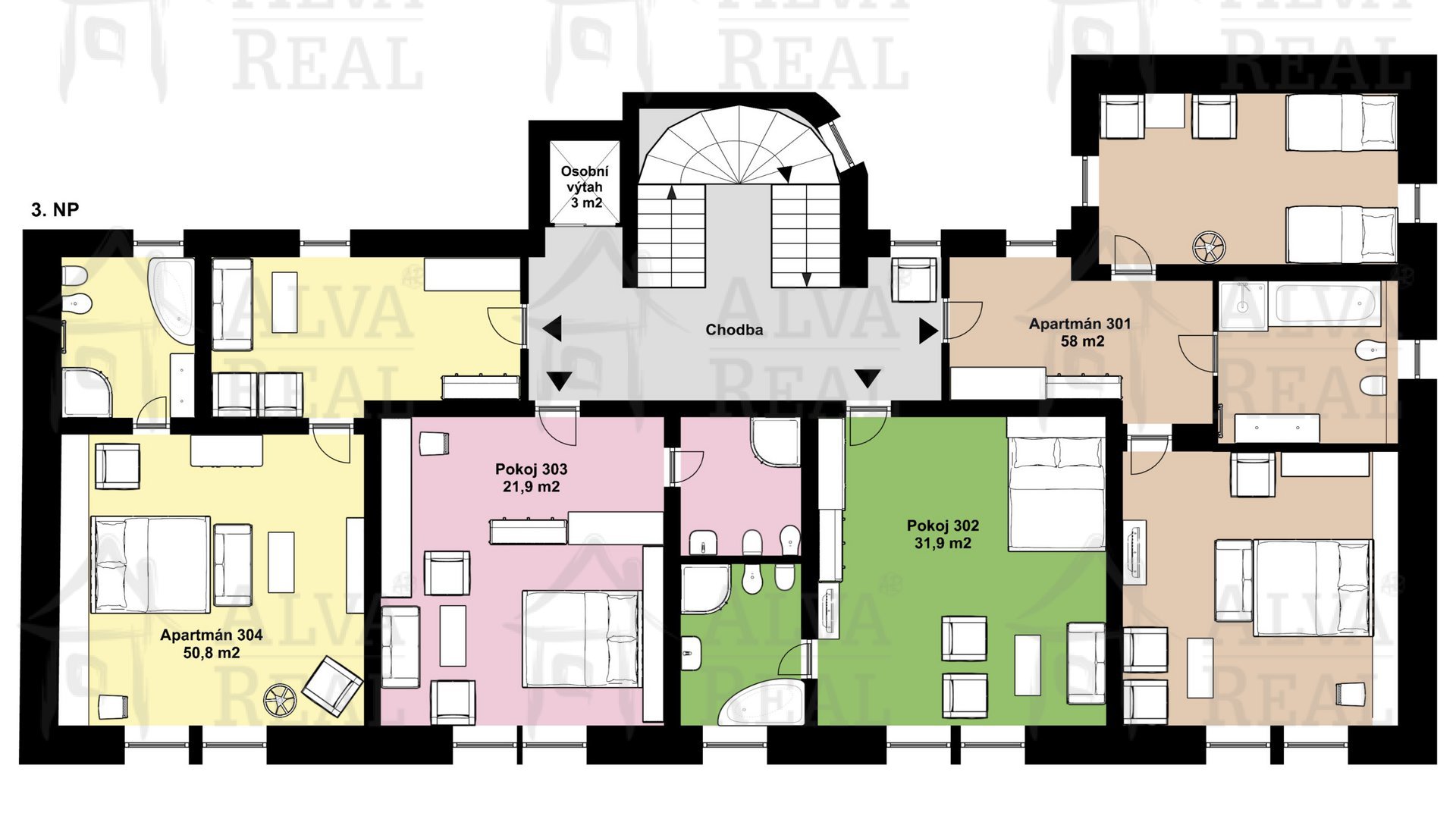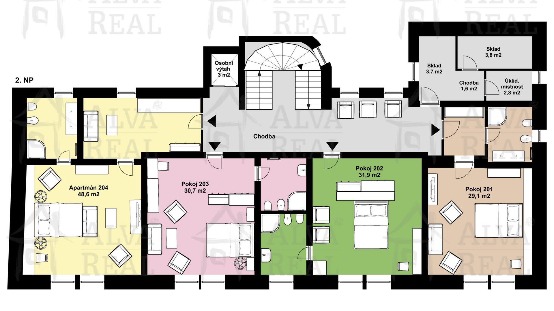 2.NP a 3.NP: hotelové pokoje a apartmán, v 2.NP úklidová místnost a sklad prádla.