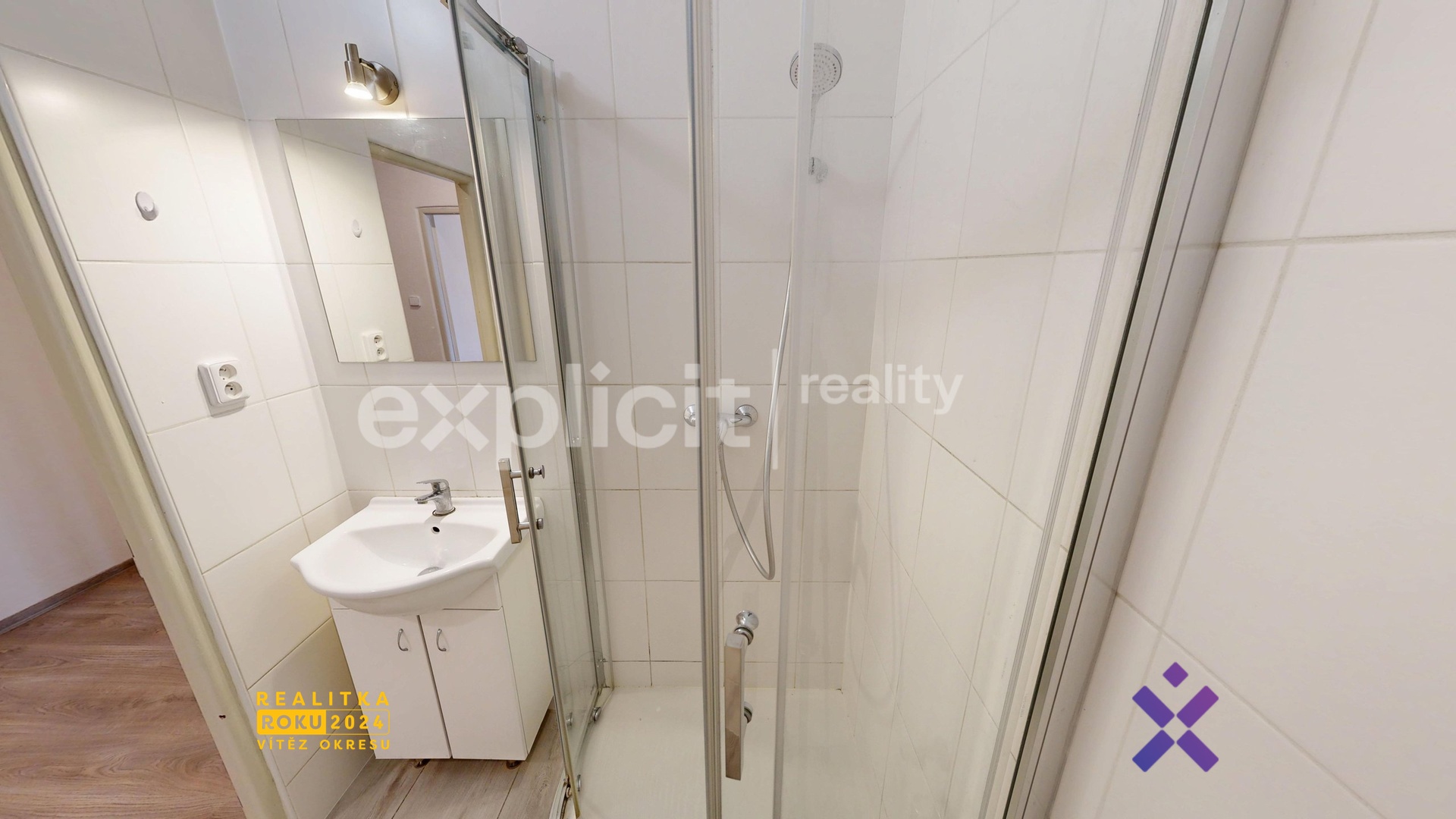 U vstupu se nachází koupelna se sprchovým koutem a přípojkou na pračku.