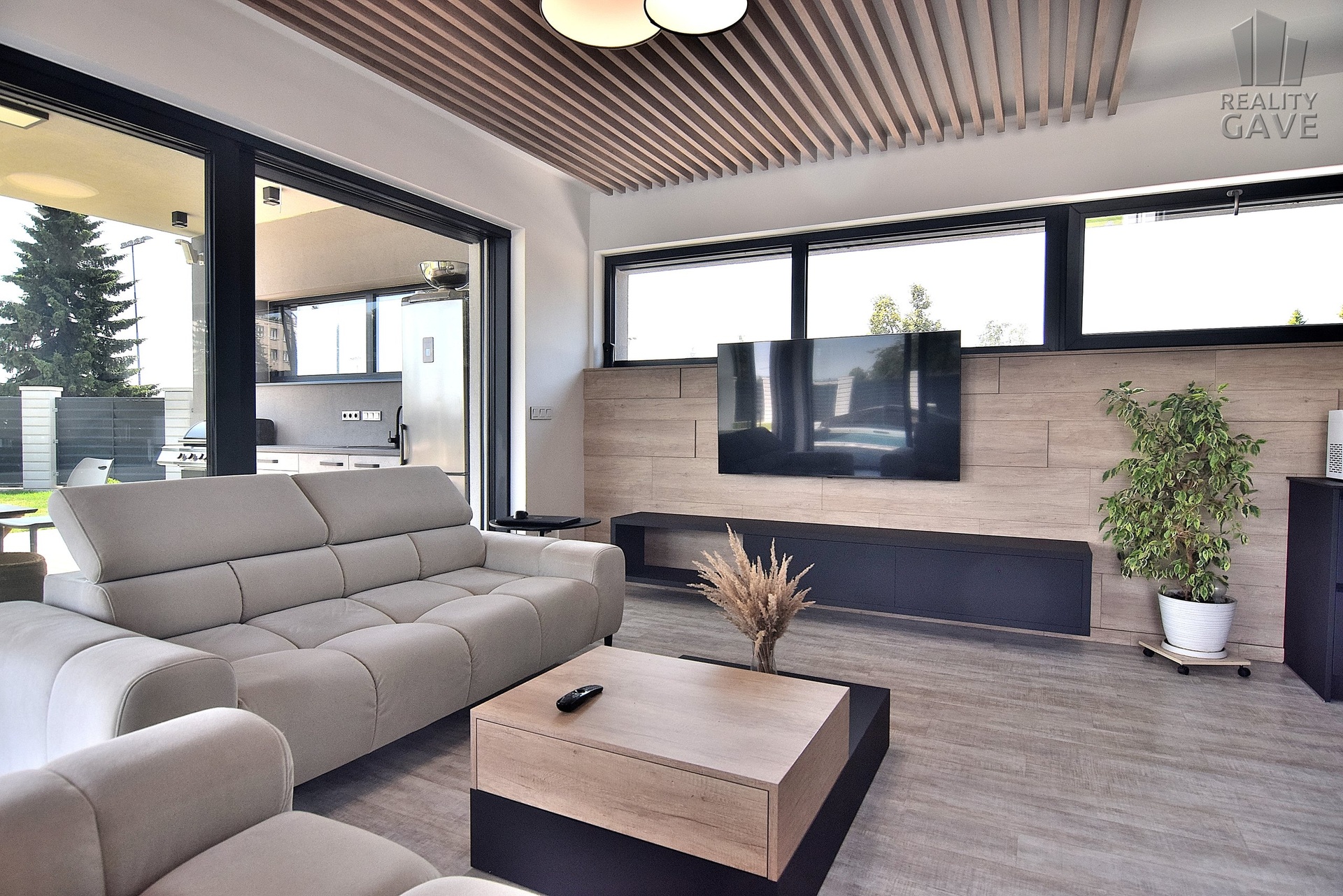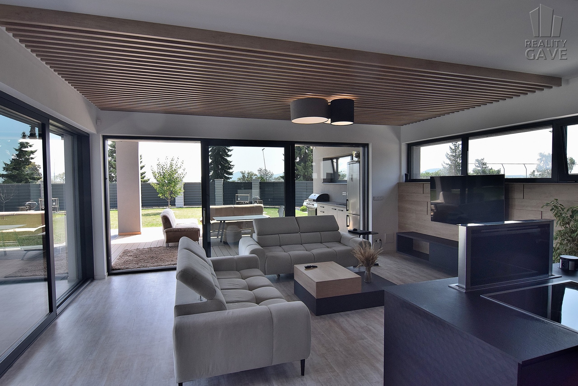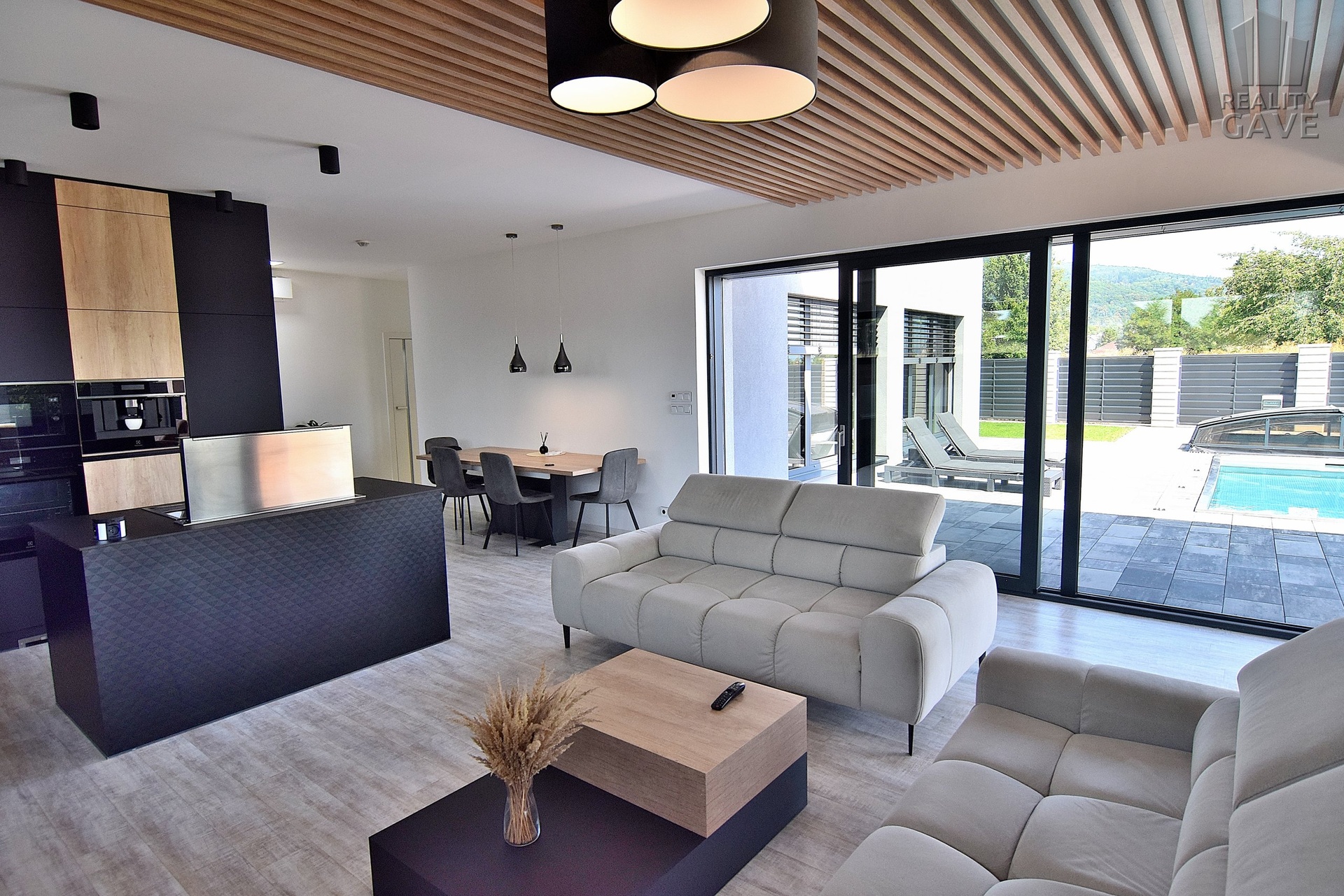 Hlavní obytný prostor je definicí moderního luxusu – otevřený, vzdušný a zaplavený denním světlem díky velkoformátovým proskleným stěnám a okny s venkovními žaluziemi. Každý pohled směřuje ven – na terasu, bazén a upravenou zahradu. Díky ostrůvku nevaříte do zdi, ale s výhledem.