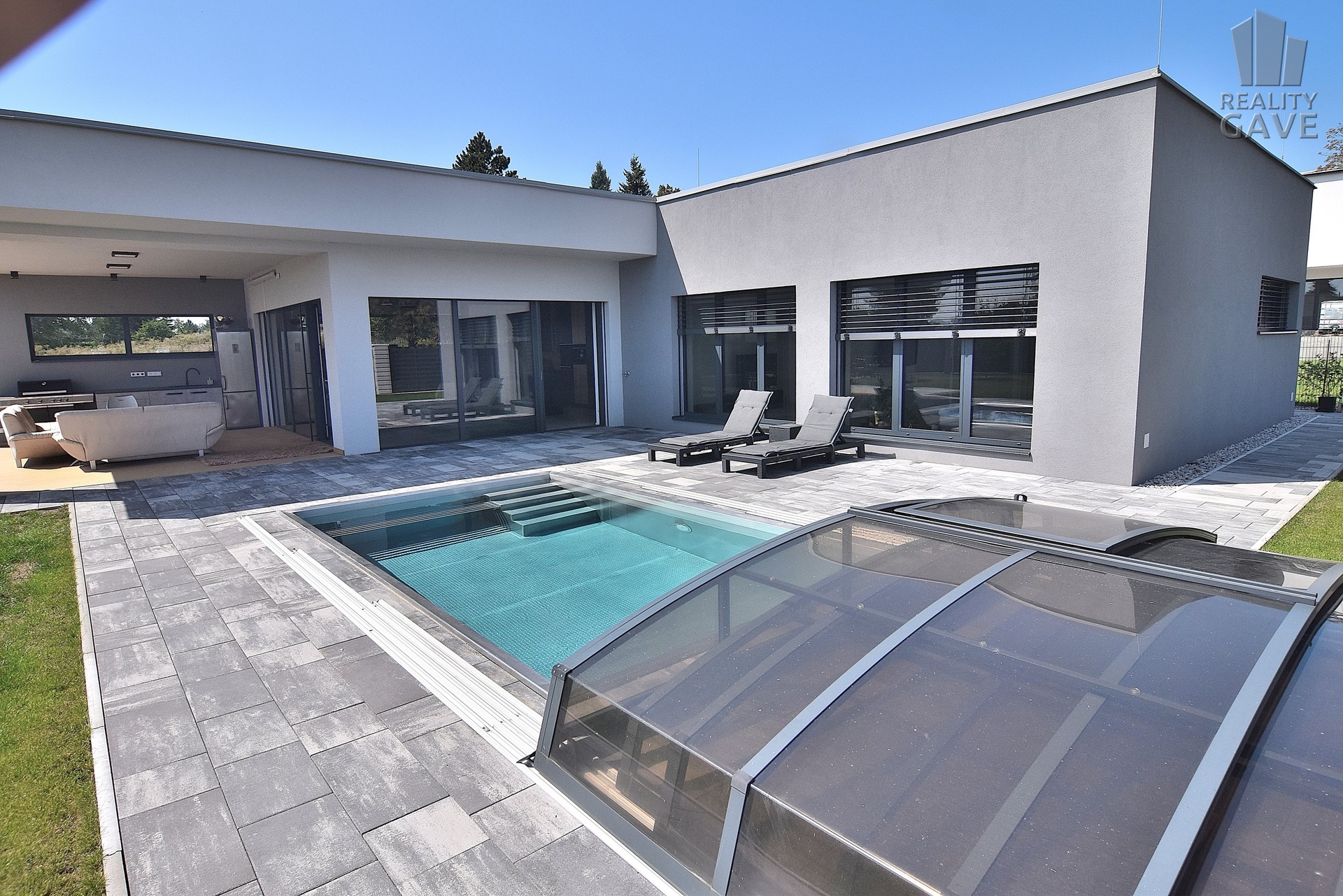Zastřešená terasa plynule navazuje na interiér a vytváří plnohodnotnou venkovní obytnou zónu s plně vybavenou letní kuchyní. Je to Ideální místo pro dlouhé letní večery, společenská setkání i klidné chvíle jen pro vás.
