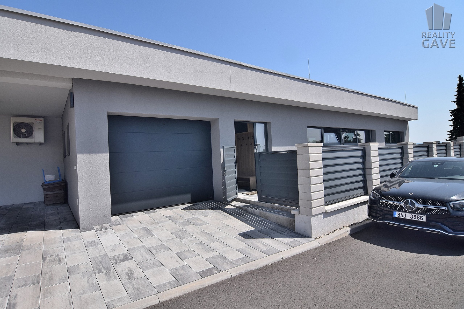 Součástí domu je garáž pro jeden vůz a další parkovací stání pod elegantním krytým přístřeškem, který architektonicky navazuje na stavbu.