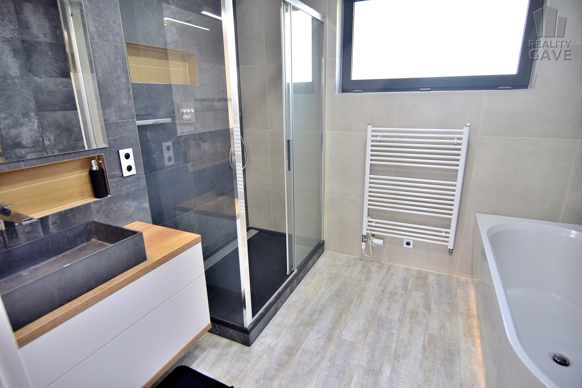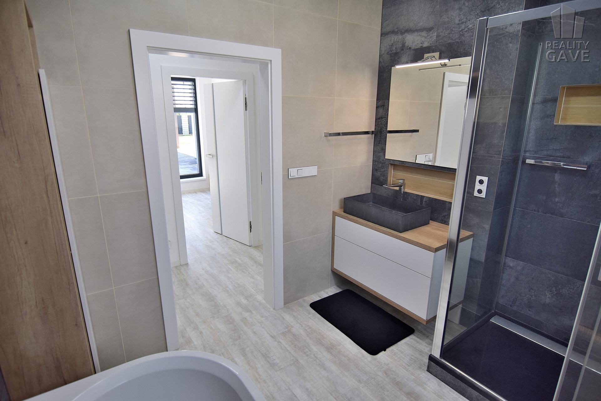Designová koupelna s vanou i sprchovým koutem je dostatečně velká a jak vystřižená z časopisu.