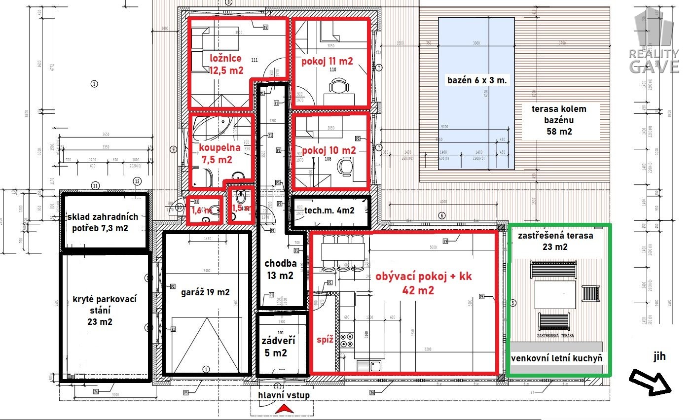 Zastavěná plocha 155 m², užitná plocha interiérů a garáže 134 m²
