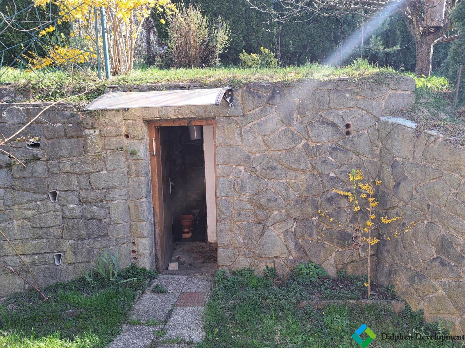 V mírném svahovém pozemku je vestavěna kamenná vinárna.