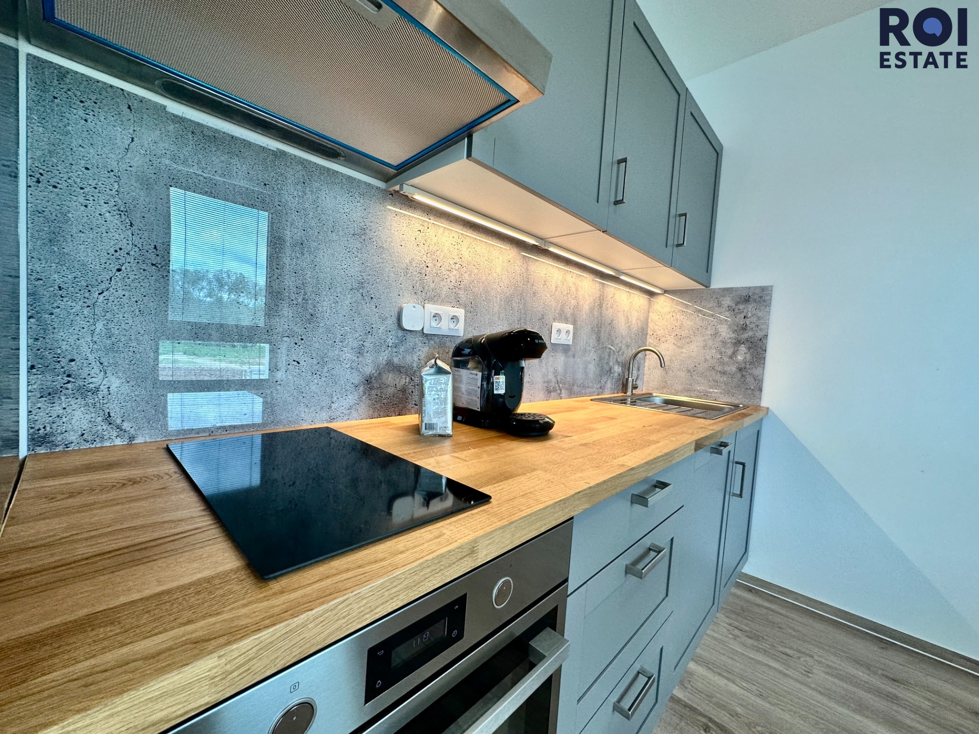 Moderní kuchyně je vybavena indukční varnou deskou s odsavačem par a dotykovým ovládáním, horkovzdušnou troubou s digitalním displejem, velkou nerezovou lednicí s mrazákem, myčkou nádobí se smart funkcemi a kávovarem zn. Bosch.
