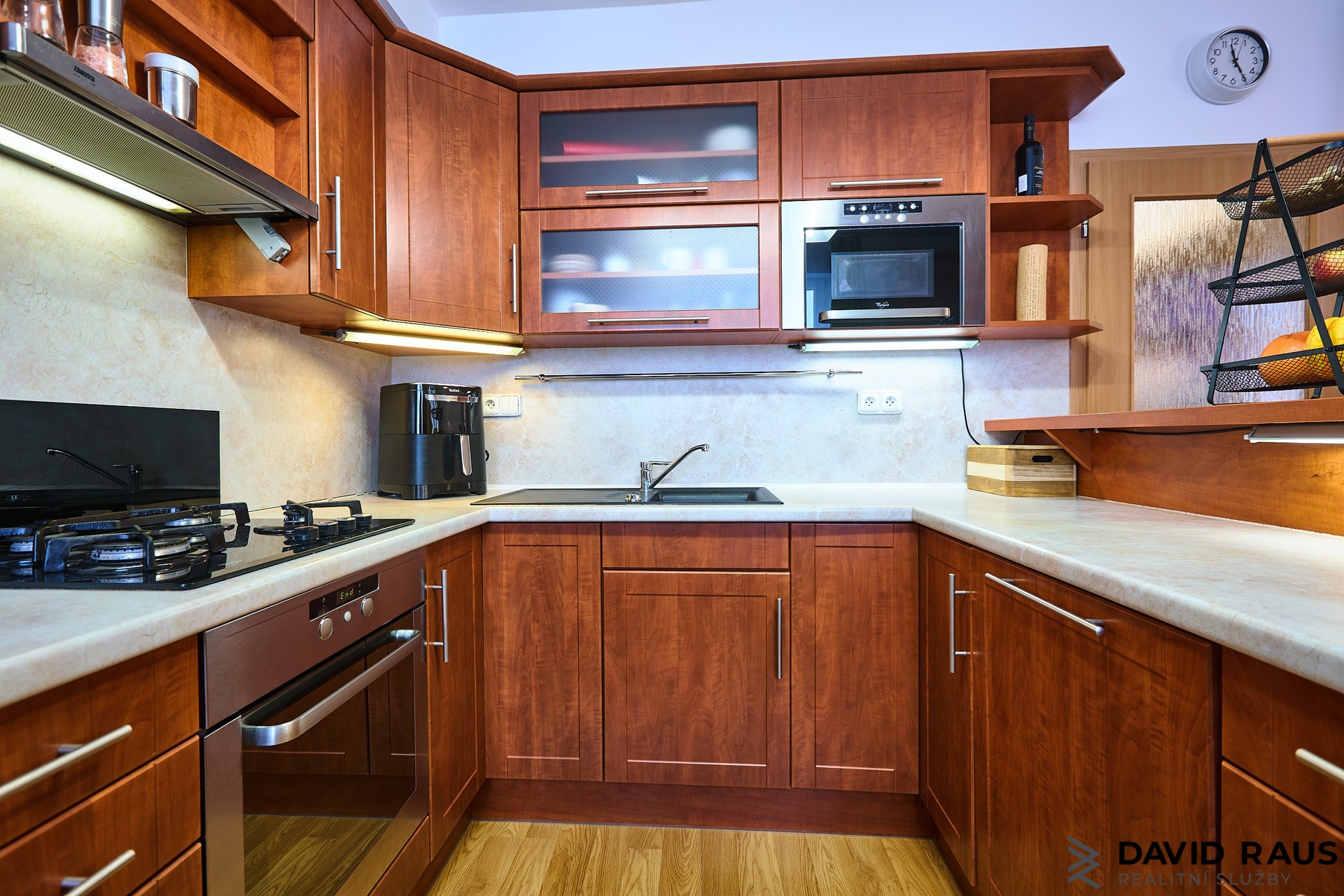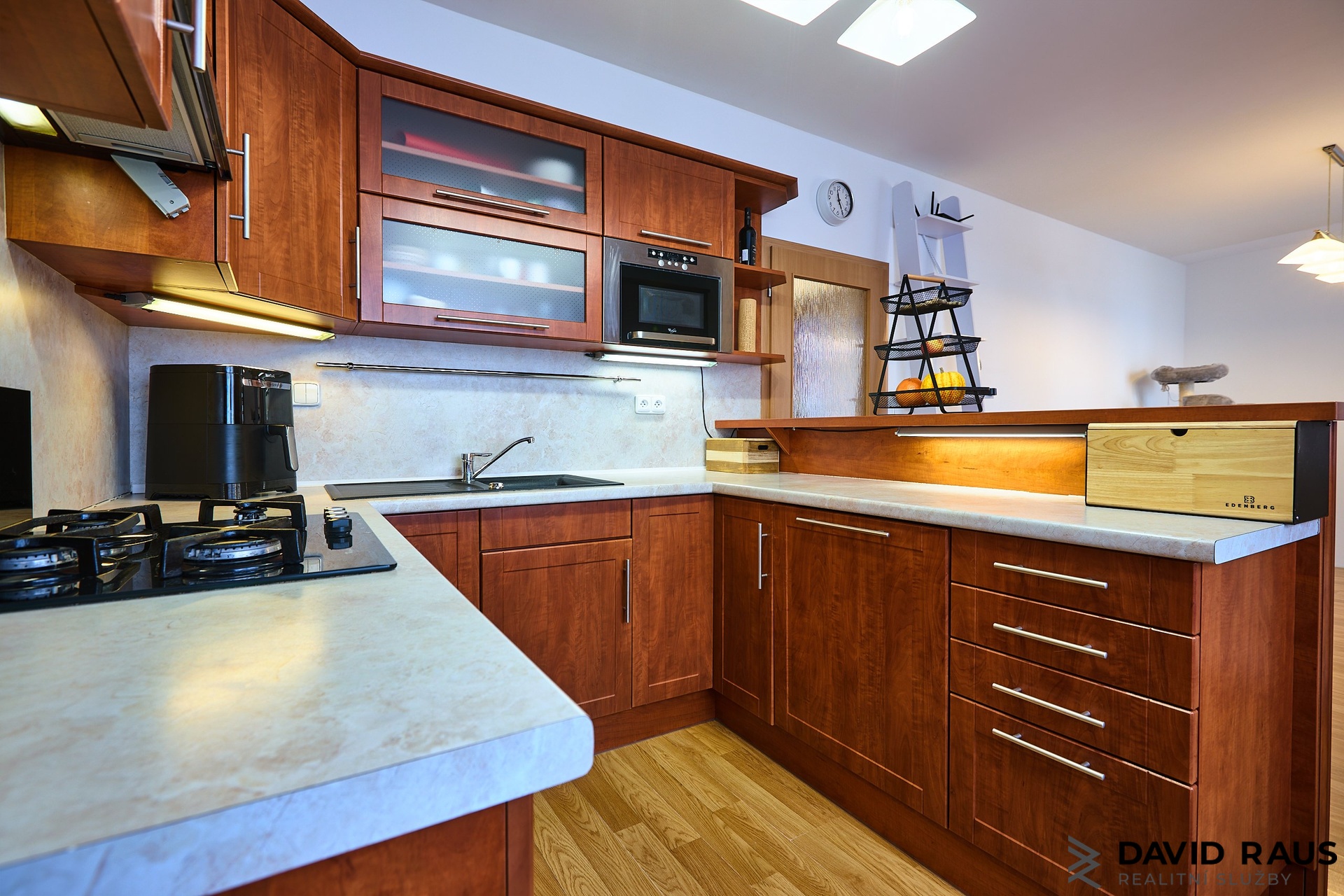 Po vstupu do bytu se nachází prostorná předsíň (5,21 m²) vybavená vestavěnou skříní, nástěnným věšákem a skříňkou na uložení věcí. Na podlaze je praktická dlažba. Z předsíně je přístup do všech místností. Koupelna (4,63 m²) je dostatečně prostorná, vybavená vanou, úložnými skříňkami a nabízí i prostor pro pračku. Součástí je také kotel. Toaleta (1,35m²) je samostatná. Ložnice (14,01m²) disponuje laminátovou podlahou, plastovými okny a radiátorem. Praktickým prvkem je vestavěná skříň z IKEA se závěsy místo klasických dveří. Obývací pokoj (23,74m²) je propojen s kuchyňským koutem a jídelní částí. Podlahu tvoří kombinace laminátu. Kuchyňská linka je v dekoru třešňového dřeva a je vybavena vestavěnými spotřebiči značky Whirlpool – mikrovlnnou troubou, plynovou varnou deskou, troubou a myčkou. Za kuchyňskou částí se nachází další pokoj (14,39m²), aktuálně využívaný jako dětský. Je vybaven patrovými postelemi, velkou šatní skříní a pracovním stolem pod oknem vhodným pro dvě osoby. Okna v bytě jsou plastová a vybavená žaluziemi. V obývacím pokoji je umístěna sušička, kterou lze případně přesunout do koupelny.