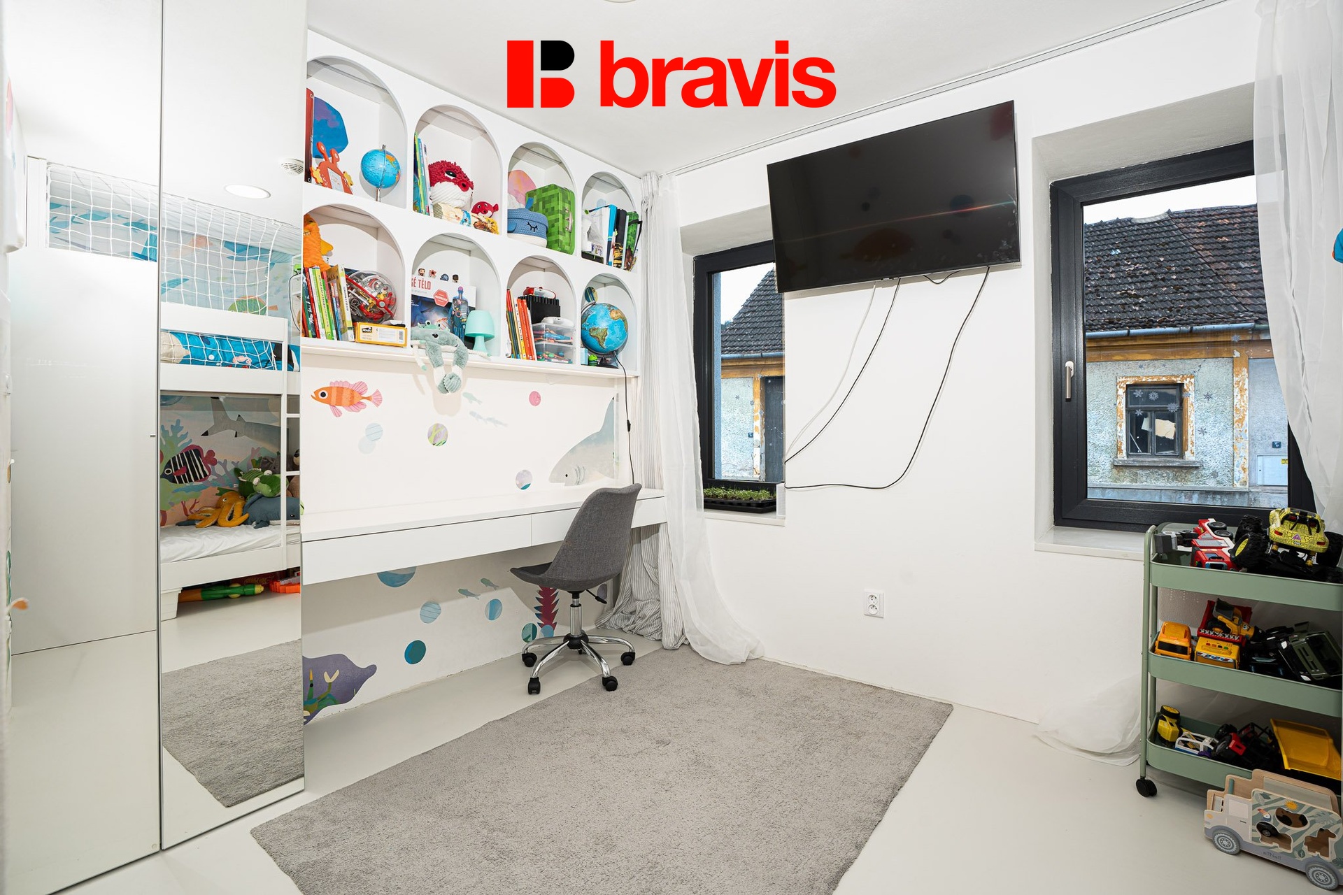 • Dětský pokoj (9,15 m²) - s nábytkem na míru – dvě postele, pracovní stoly i úložné prostory.