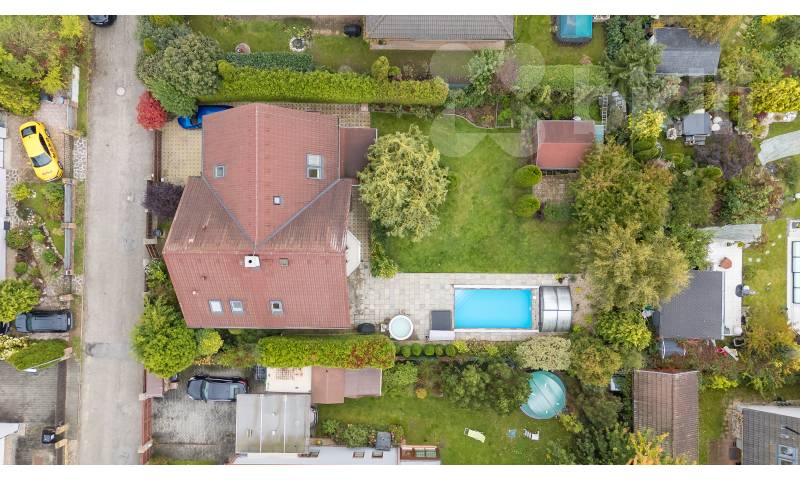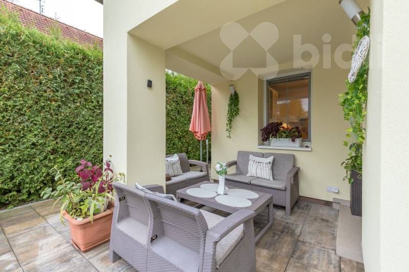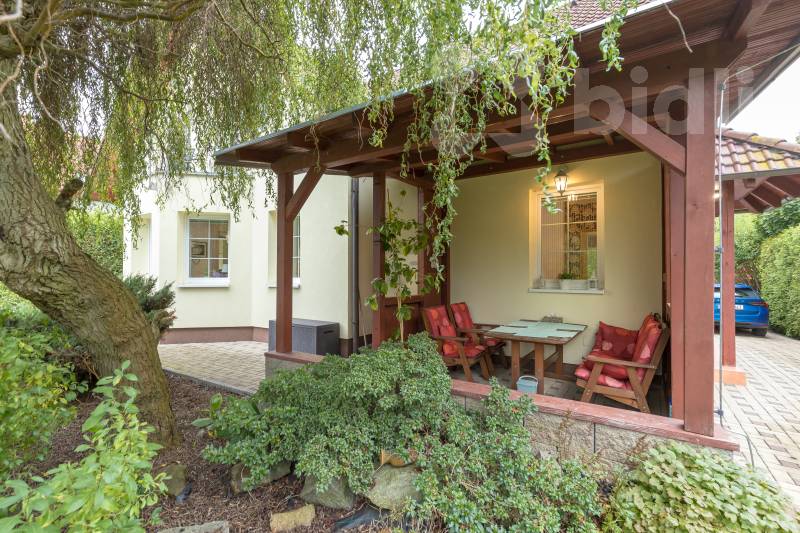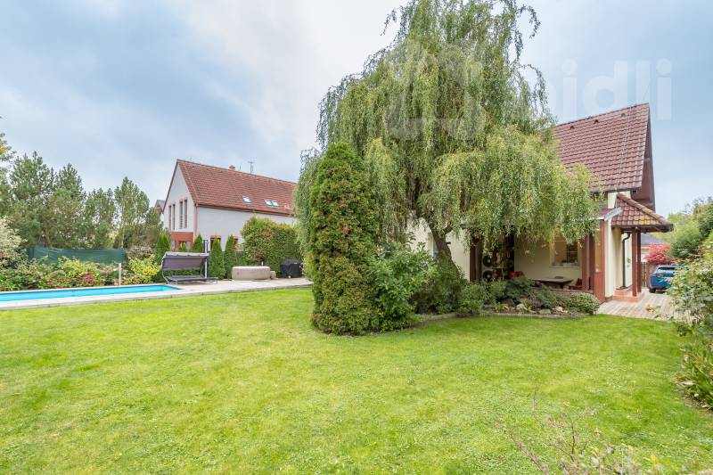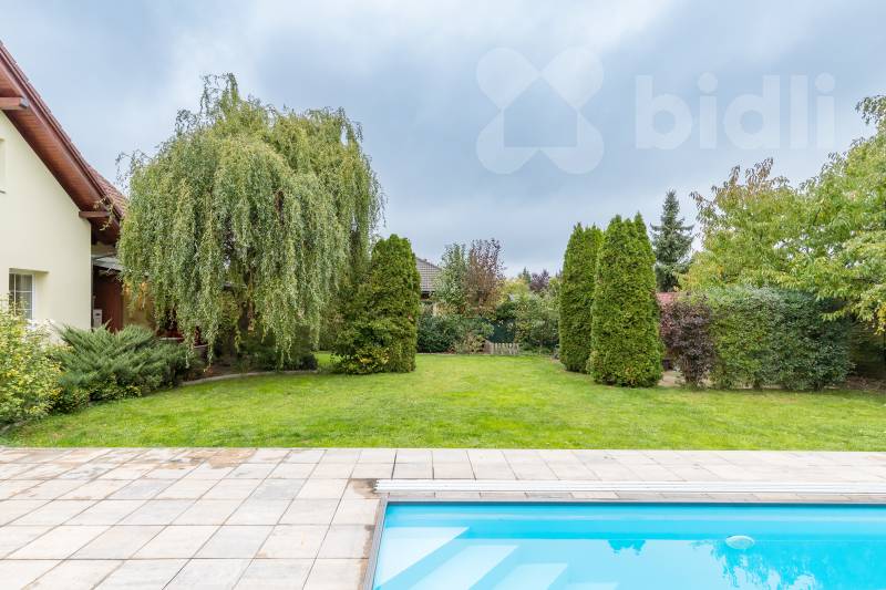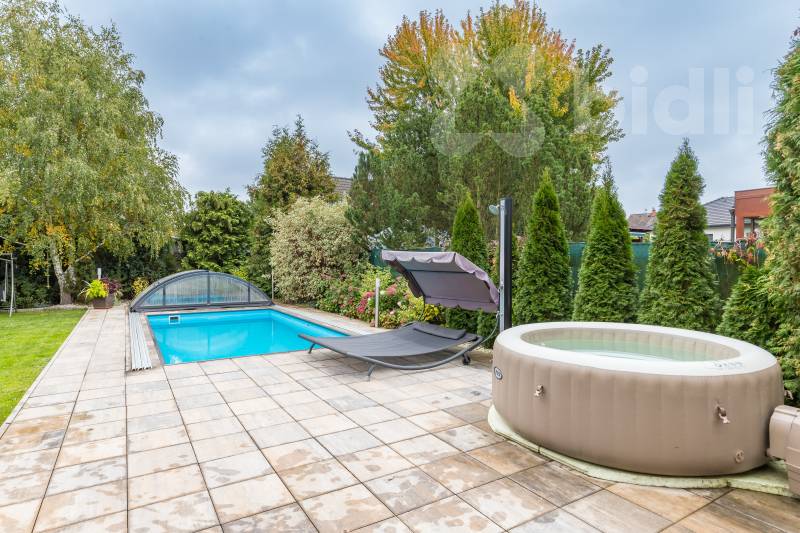 Pozemek o výměře 778 m2 nabízí upravenou zahradu s plně vzrostlou zelení, krytý bazénem se slanou vodou, protiproudem a tepelným čerpadlem a samozřejmě zahradní domek. Vjezd na pozemek zajišťuje elektrická brána na dálkové ovládání, parkování je možné přímo na pozemku.